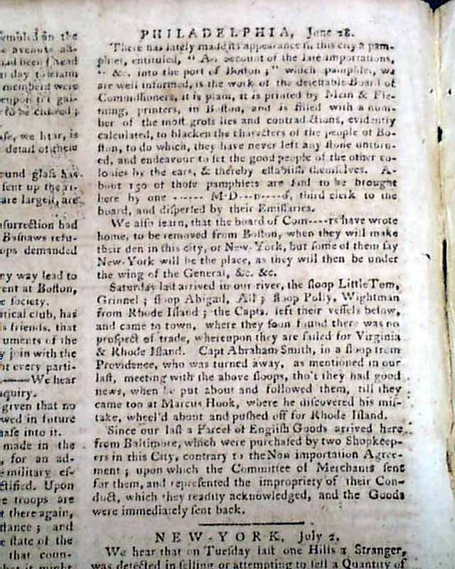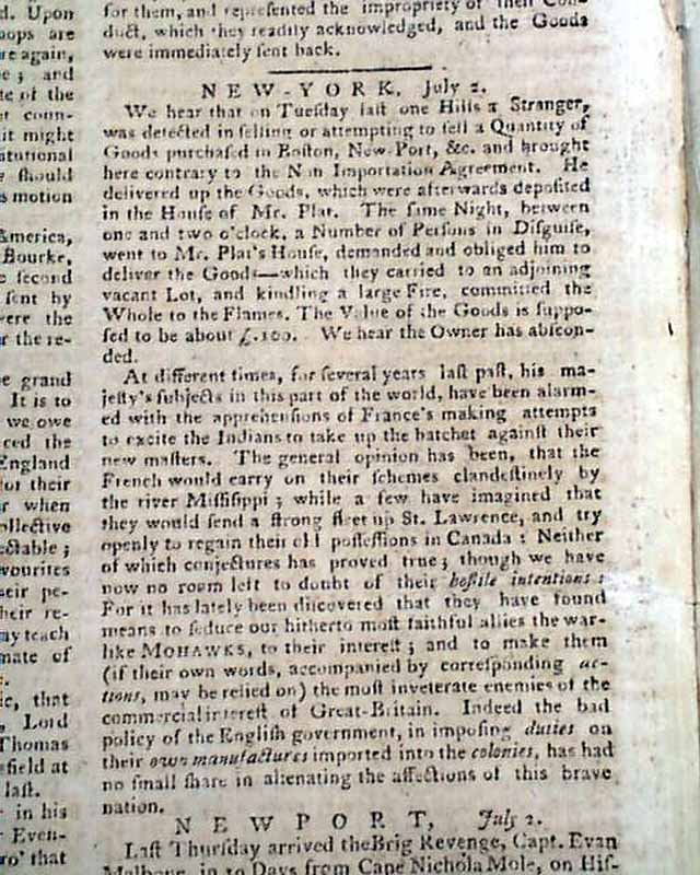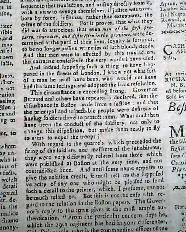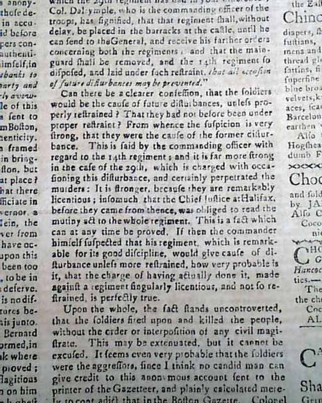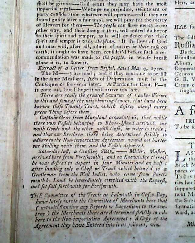 Talk of the Boston Massacre continues inside as well, too much to mention in total. A few random bits include: "...the many outrages & massacres that have lately been committed by the army...This last tragedy is at once the most bloody & the most cruel & cowardly of any...that 5 days before the massacre he met 4 soldiers of the 29th regiment & that he heard them say, that there were a great many that would eat their dinner on Monday, that should not eat any on Tuesday...It is to be hoped however that Capt. Preston, and his fellow murderers, have already met with the fate they deserve...done for us respecting the removal of the troops or not sending more for the future; and that is, we are to pledge ourselves, to shew mercy rather than exact severe justice upon Capt. Preston & the soldiers who fired among the people on the fatal 5th of March..." and even more. There is also some reporting concerning the Non-Importation Agreement.