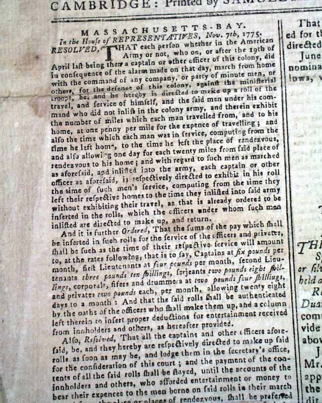 Almost equally as interesting is a front page, nearly column-long "Resolve" from the Massachusetts legislature essentially calling for soldiers who participated in the battle of Lexington & Concord to submit their travel expenses, and details concerning pay for soldiers. It begins: "That each person whether in the American Army or not, who on, or after the 19th of April last...did in consequence of the alarm made on that day, march from home with the command of any company or party of minute men...for the defence of this colony..." with much more.