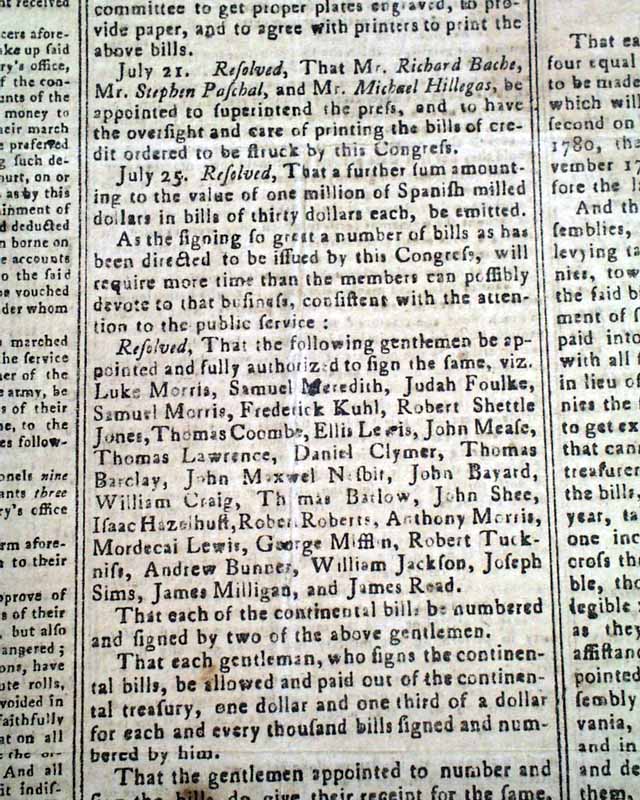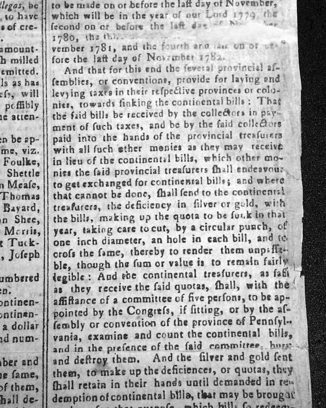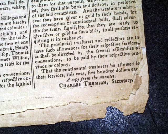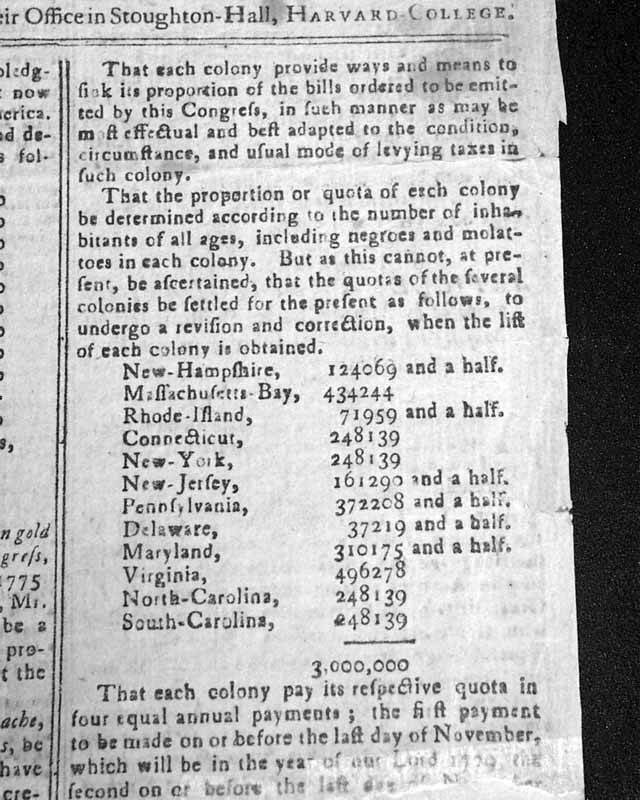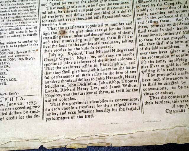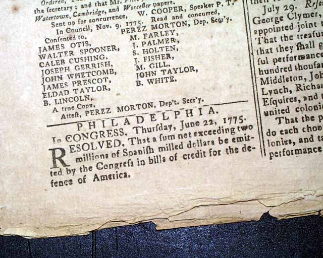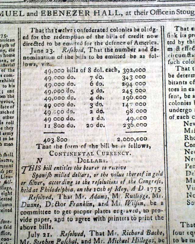 THE NEW ENGLAND CHRONICLE OR THE ESSEX GAZETTE, Cambridge, Nov. 16, 1775  A very significant issue in the financial history of the United States, as the front page reports the first issuance of Continental Currency to support the Revolutionary War. Datelined: "Philadelphia, In Congress, Thursday, June 22, 1775" it reports: "Resolved, That a sum not exceeding two millions of Spanish milled dollars be emitted by the Congress in bills of credit for the defence of America." What follows, taking up two-thirds of the front page, are the details of this historic document, portions including: "That the twelve confederated colonies be pledged for the redemption of the bills of credit now directed to be emitted for the defence of America...That the number& denomination of the bills to be emitted be as follows..." and what follows is the list.