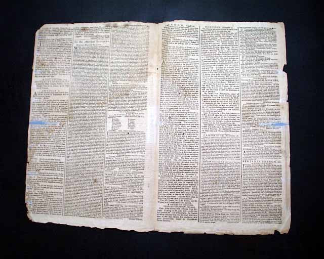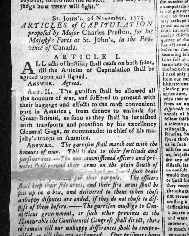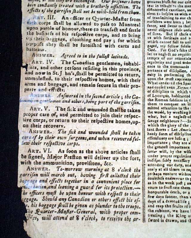 Page 2 has the: "Articles of Capitulation Proposed by Major Charles Preston for his Majesty's Forts at St. John's in the Province of Canada" and a related letter from General Montgomery on its capture (some loss here; see photos). Much of the balance of page 2 is taken up with an excellent letter: "To the American Soldier -- Worth Fellow Solders" which is signed: A Soldier.