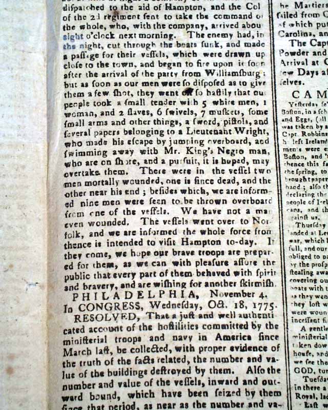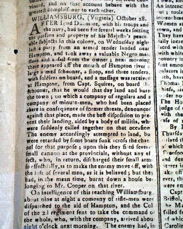 Page 3 has a report from Williamsburg which begins: "After Lord Dunmore, with his troops & the navy...been for several weeks seizing the persons & property of his Majesty's peaceable subjects in this colony...a party from armed tender landed near Hampton & took away a valuable Negro man slave and a sail from the owner; next morning there appeared off the mouth..." with more on the troubles there.