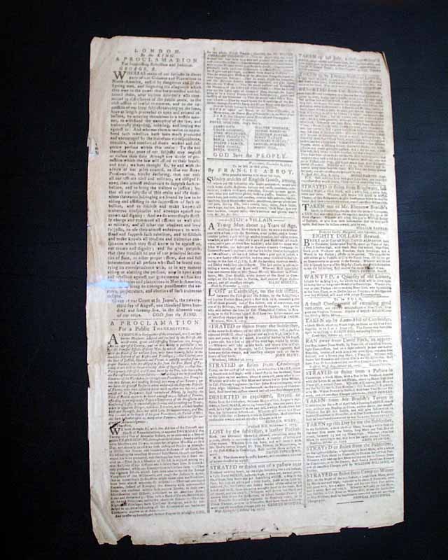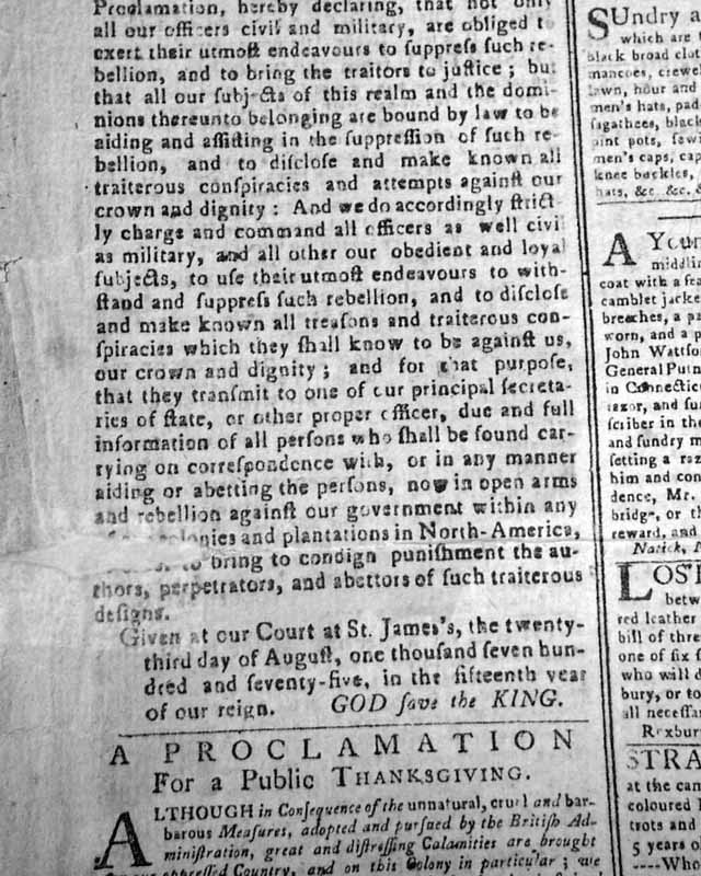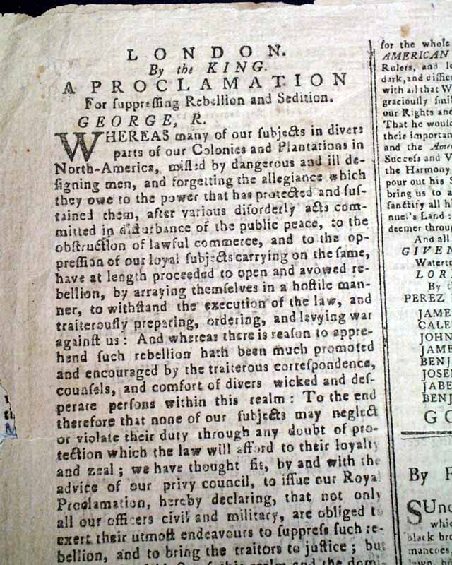 And as if all this great content was not sufficient, the back page begins with: "By the King, A PROCLAMATION For Suppressing Rebellion and Sedition" which has near the beginning: "Whereas many of our subjects in divers pats of our Colonies...misled by dangerous and ill designing men, & forgetting the allegiance which they owe to the power that has protected & sustained them..." with more.