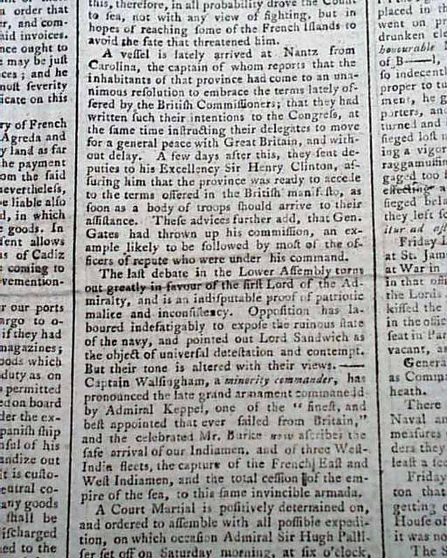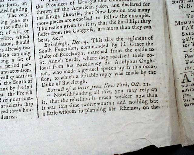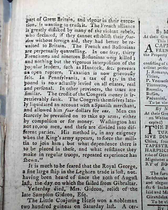 Page 2 has some text concerning Comte D'Estaing and his naval squadron from Boston. Also reports from New York noting in part: "...that the rebellion is much weaker now than it was this time twelve month; and nothing but a little wisdom in planning her schemes on the part of Great Britain, and vigor in their execution is wanting to crush it. The French alliance is greatly disliked by many of the violent rebels...The French & Bostonians are perpetually quarreling...Washington has not 10,000 men, and these are divided into different parties..." with more.