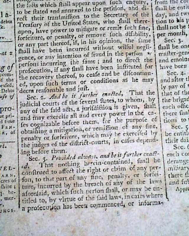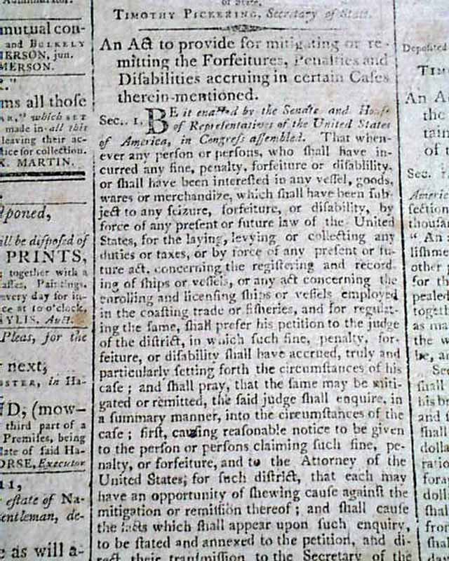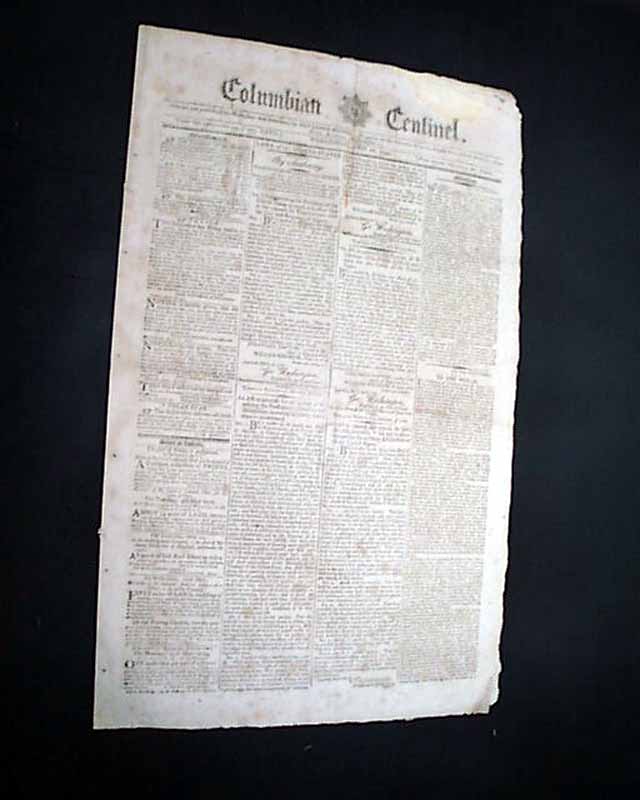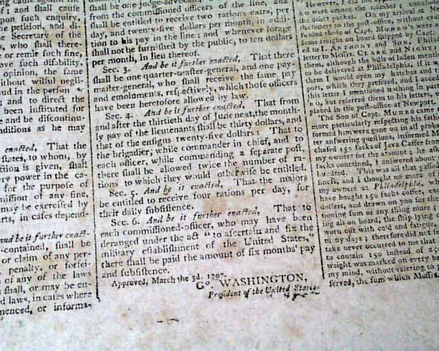 COLUMBIAN CENTINEL, Boston, April 26, 1797 The front page features not one, but four documents each signed by the President: Go. Washington, three of them are signed in the very desirable script type. One of the Acts relates to fixing the military establishment of the United States.
