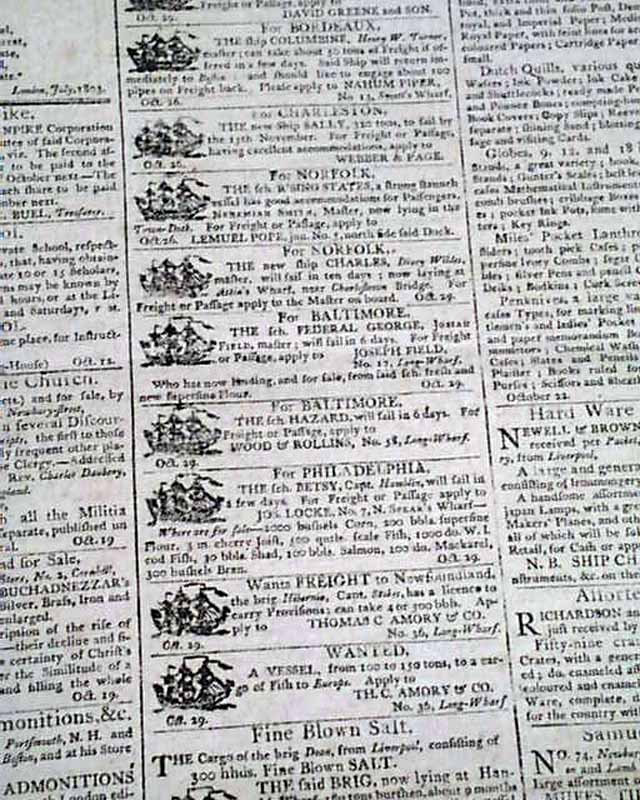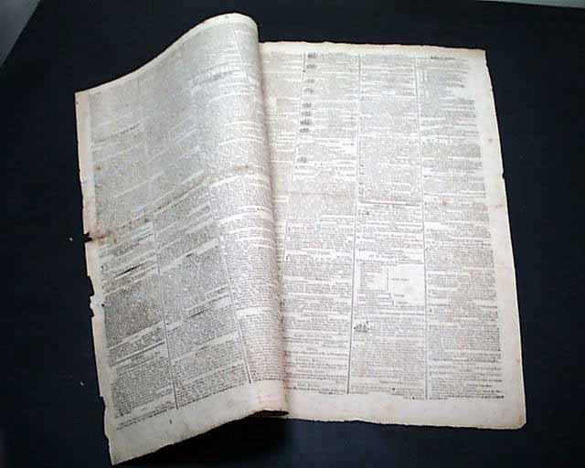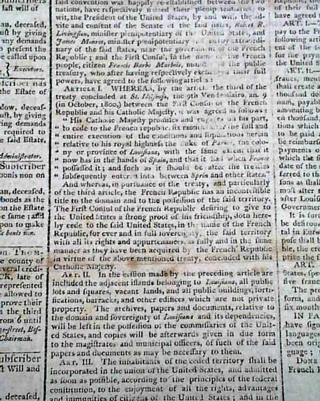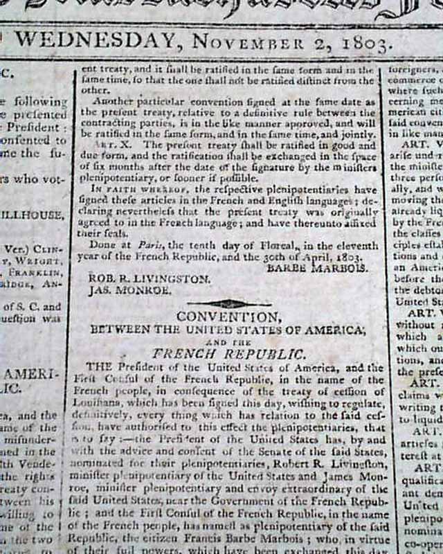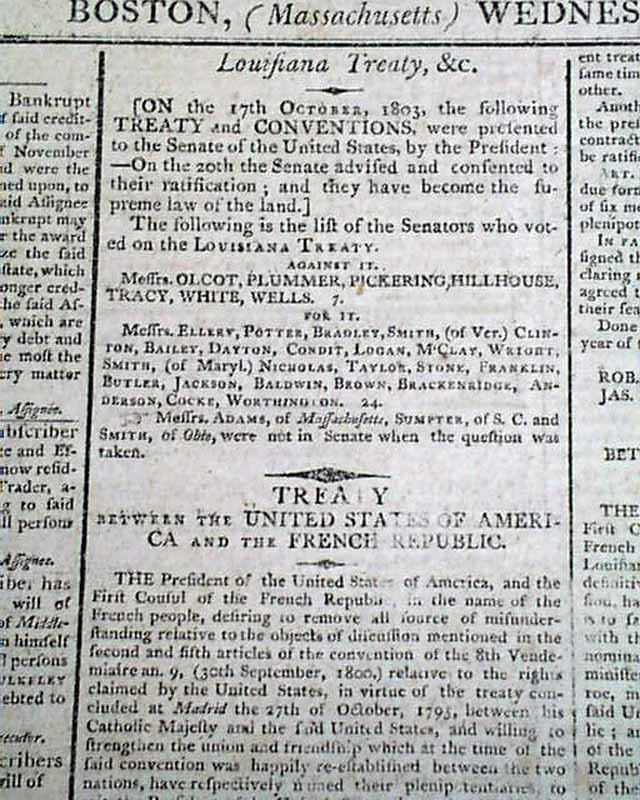 COLUMBIAN CENTINEL, Boston, Nov. 2, 1803 The top of the front page has an historic notice headed: "Louisiana Treaty" announcing the ratification of the treaty by the Senate by which the United States acquired the Louisiana Territory, referred to as the Louisiana Purchase. It lists the names of the senators who voted against the treaty and those who voted in favor of the treaty.