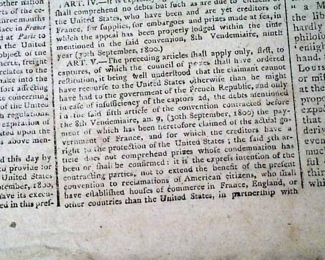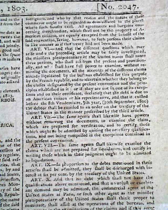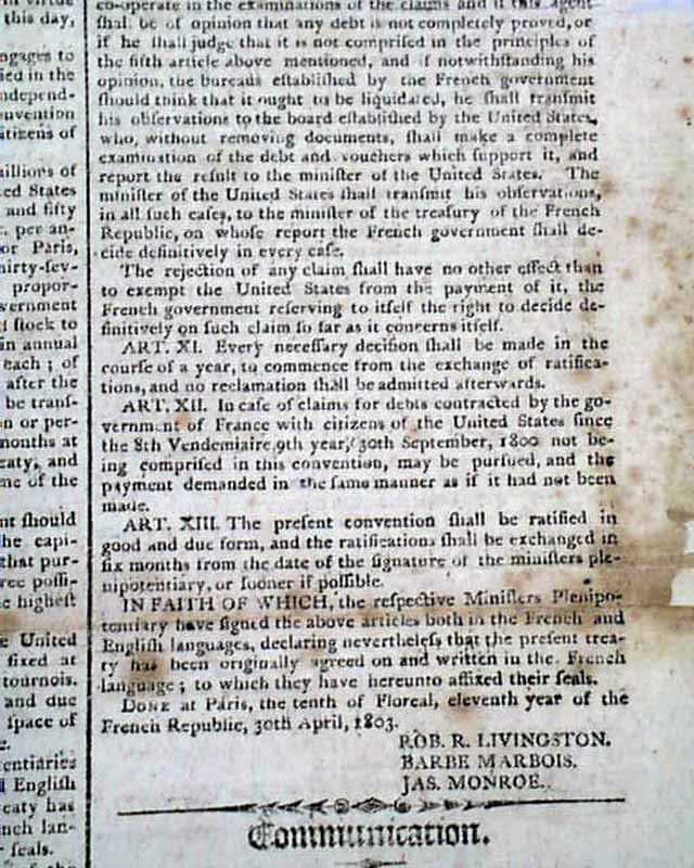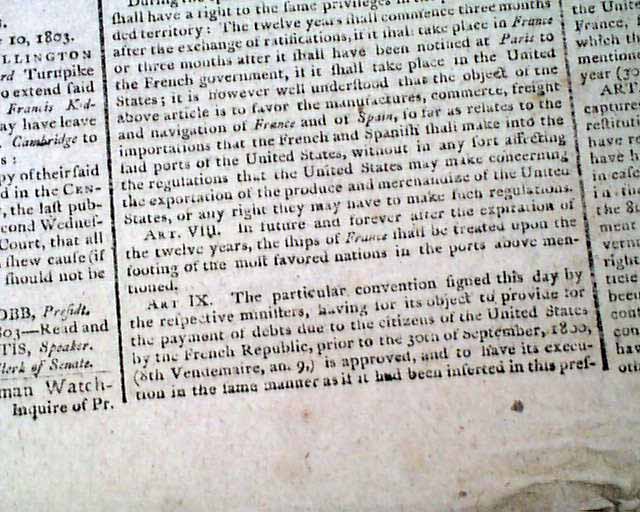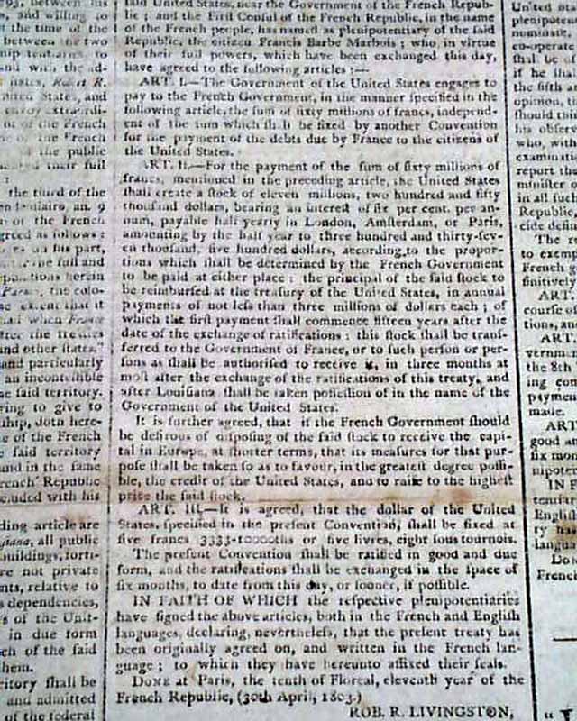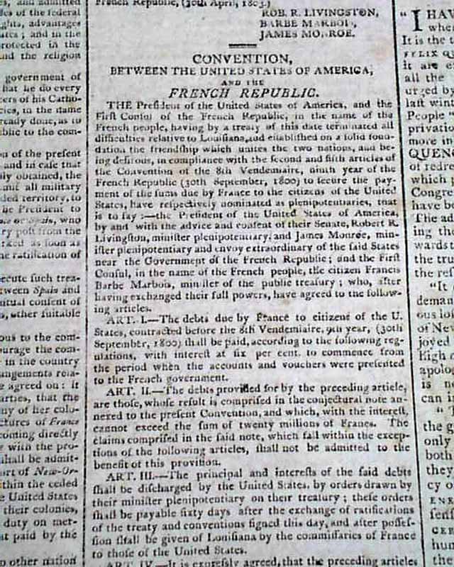 This report is followed by the text of the: "Treaty Between the United States of America and the French Republic" containing the ten articles, followed by the text of two "Conventions" each with several more articles relative to the agreement. The Treaty and two Conventions are each signed in type: Rob. B. Livingston, Barbe Marbois & Jas. Monroe. Collectively the report and the documents take 2 1/2 columns.