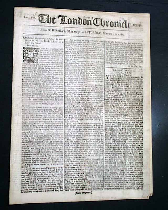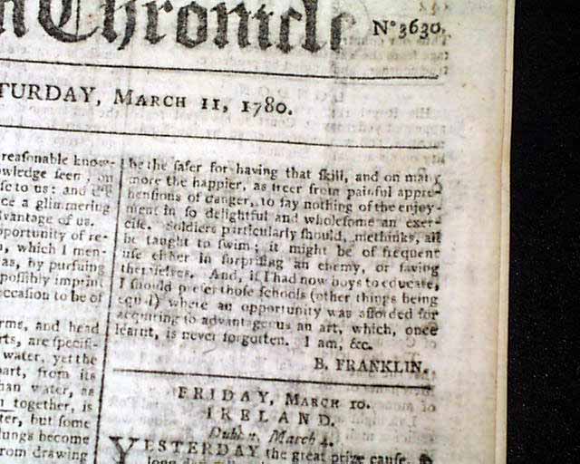 THE LONDON CHRONICLE, England, March 11, 1780 Most of the front page is taken up with an interesting article titled: "Useful Hints for Learning to Swim, By Benjamin Franklin, LL.D.F.R.S In a Letter to a Friend" which is signed by him in type: B. FRANKLIN.