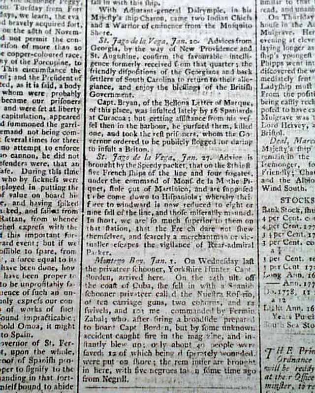 The back page has a brief item: "...brings intelligence that General Lee, disgusted with the treatment he has received from the Congress, is come over with a body of Americans, and has joined the British army under Gen. Clinton." And a bit further on is: "Advices from Georgia...confirm the favourable intelligence...the friendly dispositions of the Georgians & back settlers of South Carolina to return to their allegiance & enjoy the blessings of the British government."