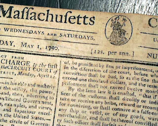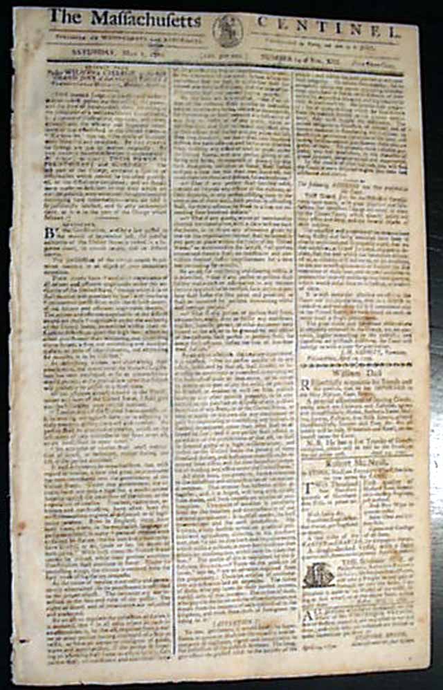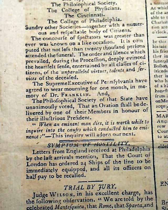 THE MASSACHUSETTS CENTINEL, Boston, May 1, 1790  A report on page 3 headed: "The Immortal Franklin" begins: "This great and good man, whose death we announced in the last Centinel, was aged 85 years--and was interred with every mark of the esteem and veneration of his fellow citizens. His last illness lasted 16 days. At his funeral the following was the order of Procession." It then lists the order of the Procession.