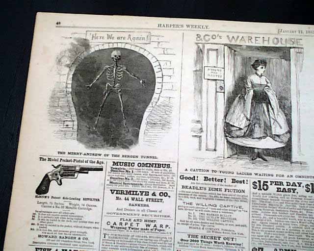 The back page has 2 cartoons: "The Merry Andrew of the Bergen Tunnel" and "A Caution to Young Ladies Waiting For an Omnibus".