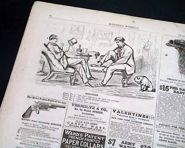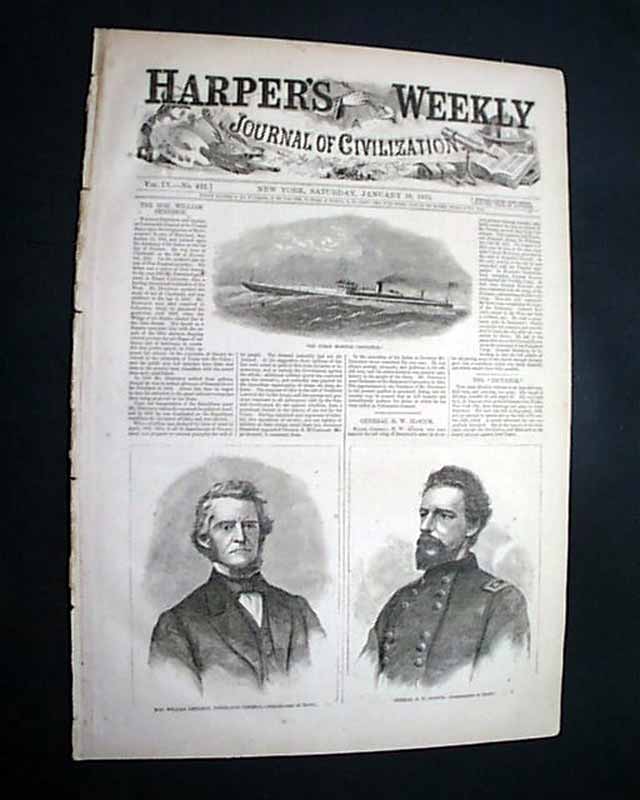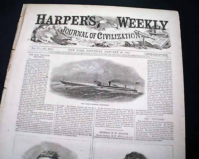 HARPER'S WEEKLY, New York, Jan. 28, 1865 The front page prints include: "The Ocean Monitor 'Dictator' ", "Hon. William Dennison, Postmaster General" and "General H. W. Slocum". Inside has a full page print: " 'Tween Decks After Action--News From Home".