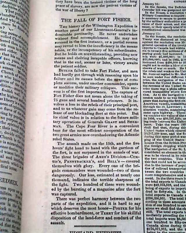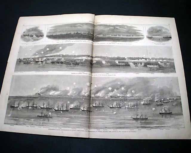The doublepage (sewn-in with small binding holes) centerfold has 5 prints including: "Bombardment of the Fortifications on Federal Point During the Debarkation of General Butler's Army" & "Landing of General Butler's Army Under Cover of the Gunboats" "The Monitors in the Gale of December 21, 1864" "Fleet of Army Transports at the Rendezvous Off Federal Point..." and "The Power Ship 'Louisiana' ".
