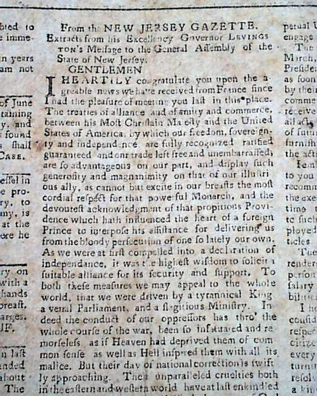 It begins: "I heartily congratulate you upon the agreeable news we have received from France...The treaties of alliance & of amity & commerce between his Most Christian Majesty & the United States of America by which our freedom, sovereignty & independence are fully recognized..." with much more, portions seen in the photos.