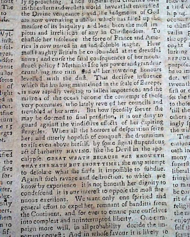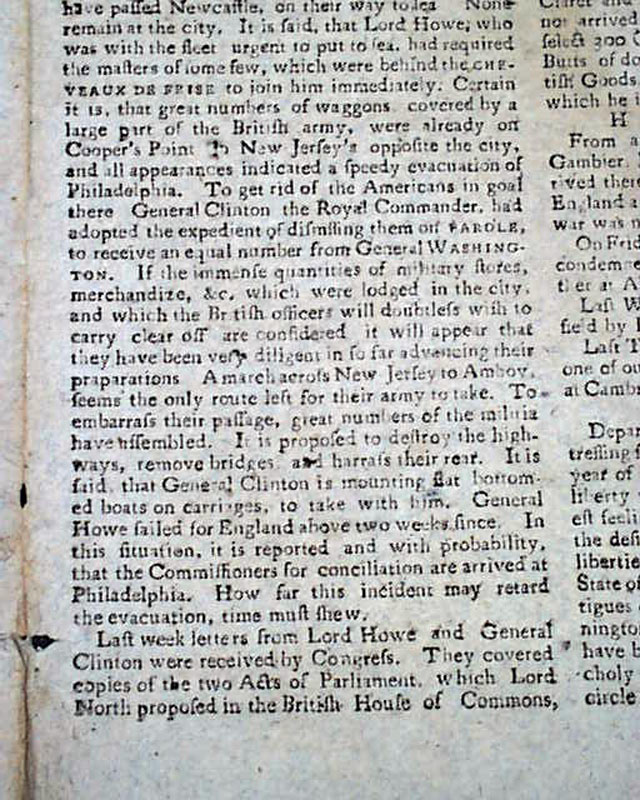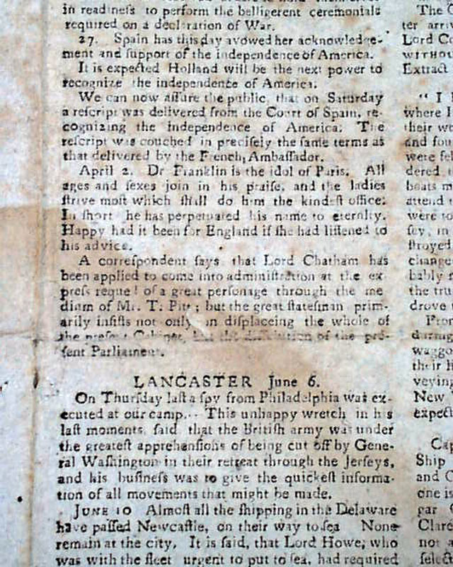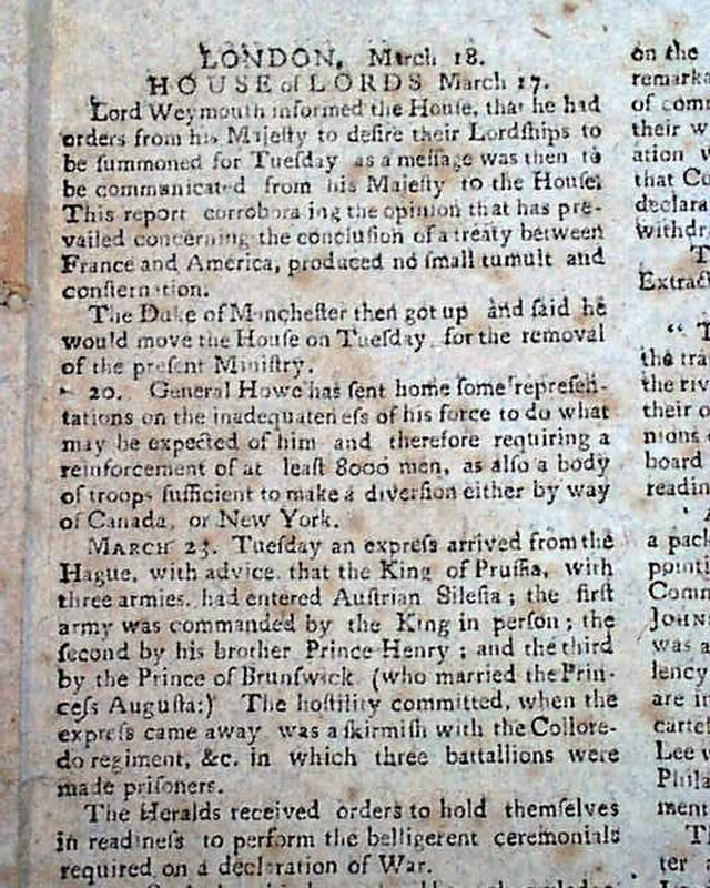 Page 3 has a report from the House of Lords which includes: "...This report corroborating the opinion that has prevailed concerning the conclusion of a treaty between France & America produced no small tumult & consternation...General Howe has sent home some representations on the inadequateness of his force to do what may be expected of him & therefore requiring a reinforcement of at least 8000 men...It is expected Holland will be the next power to recognize the independence of America...Dr. Franklin is the idol of Paris. All ages & sexes join in his praise..." and much more.
