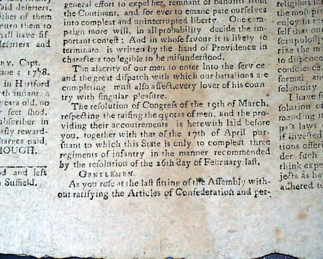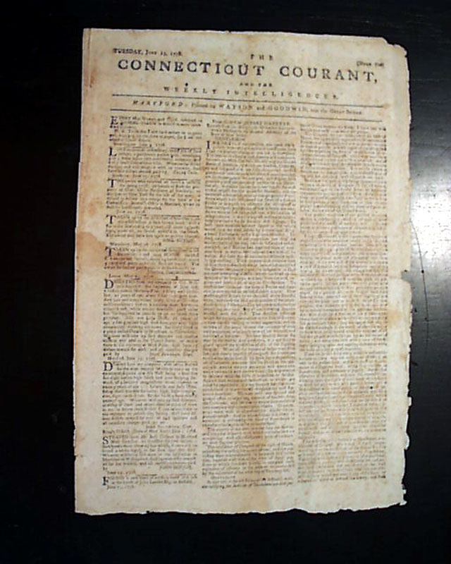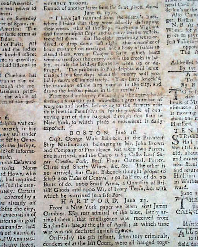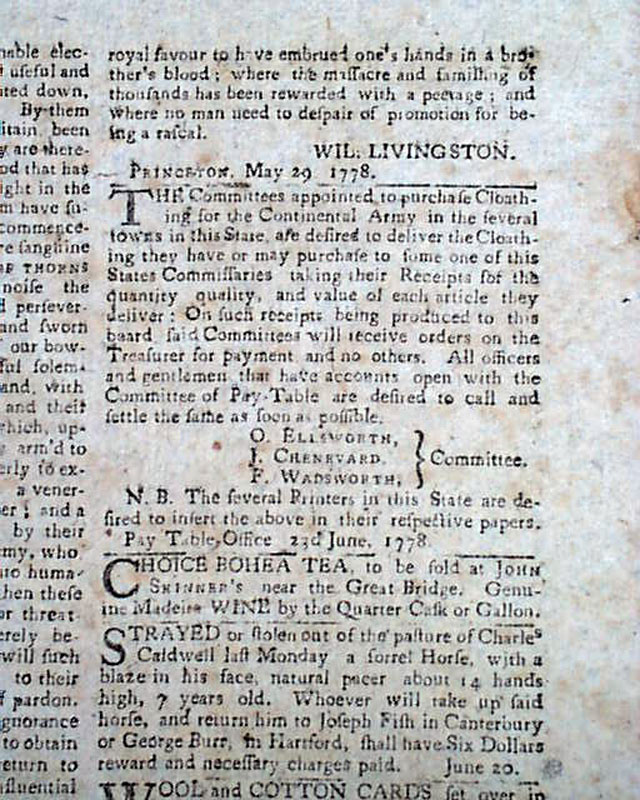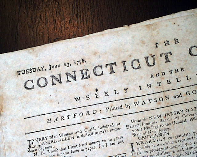 THE CONNECTICUT COURANT, Hartford, June 23, 1778 Most of the front page is taken up with an address of the governor of New Jersey to the General Assembly concerning the Revolutionary War.