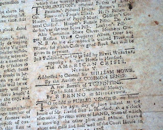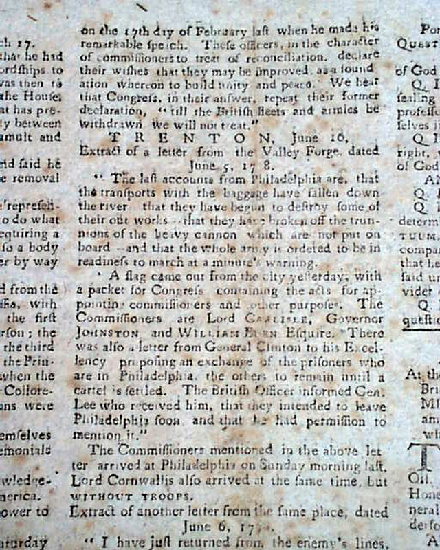 Page 3 has two letters from Valley Forge, one beginning: "I have just returned from the enemy's lines where I learnt that they were actually destroying their works...". There is also on page 3 an advertisement for: "The American Crisis, Number V, Addressed to General Sir William Howe, By the Author of Common Sense."