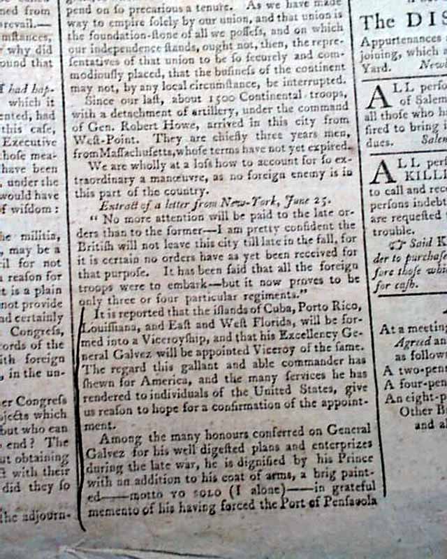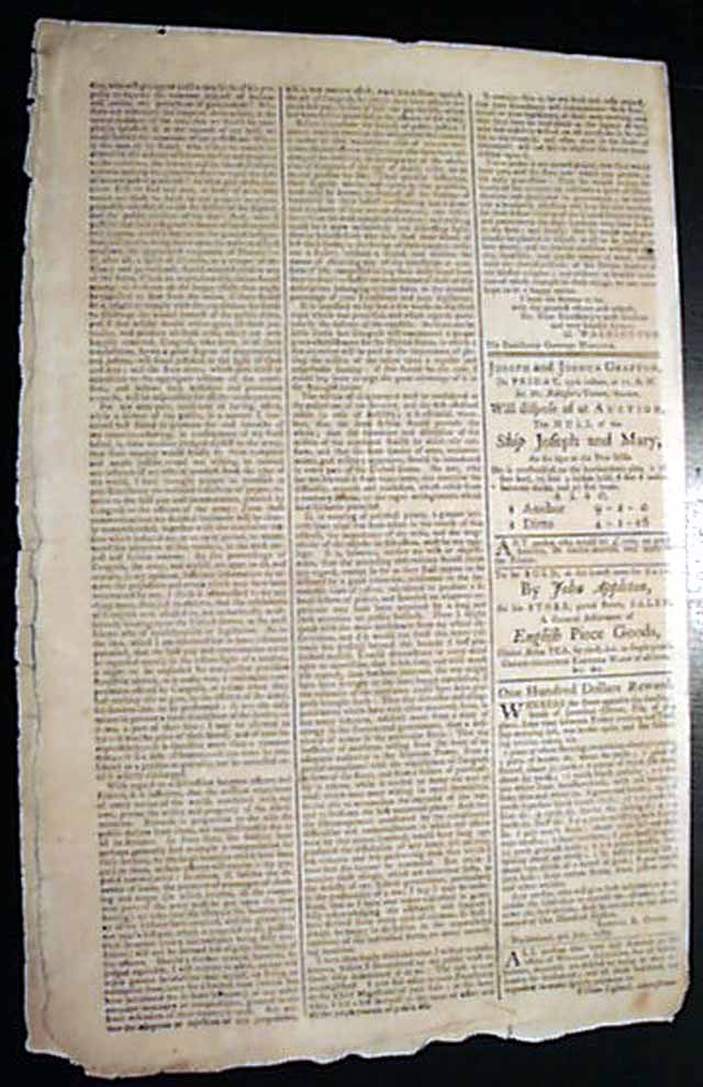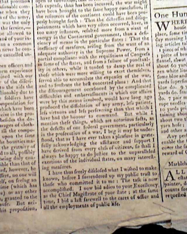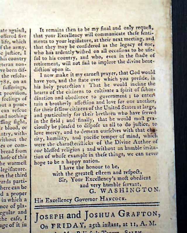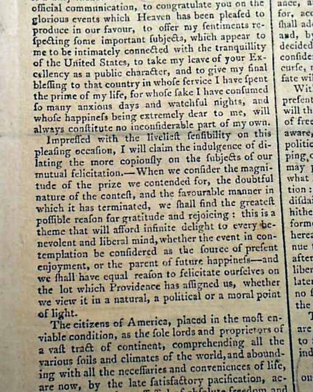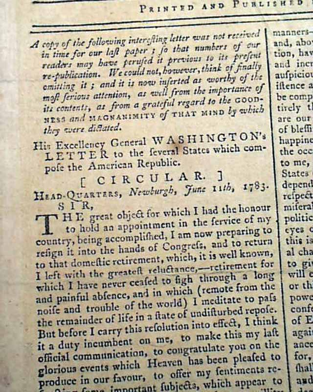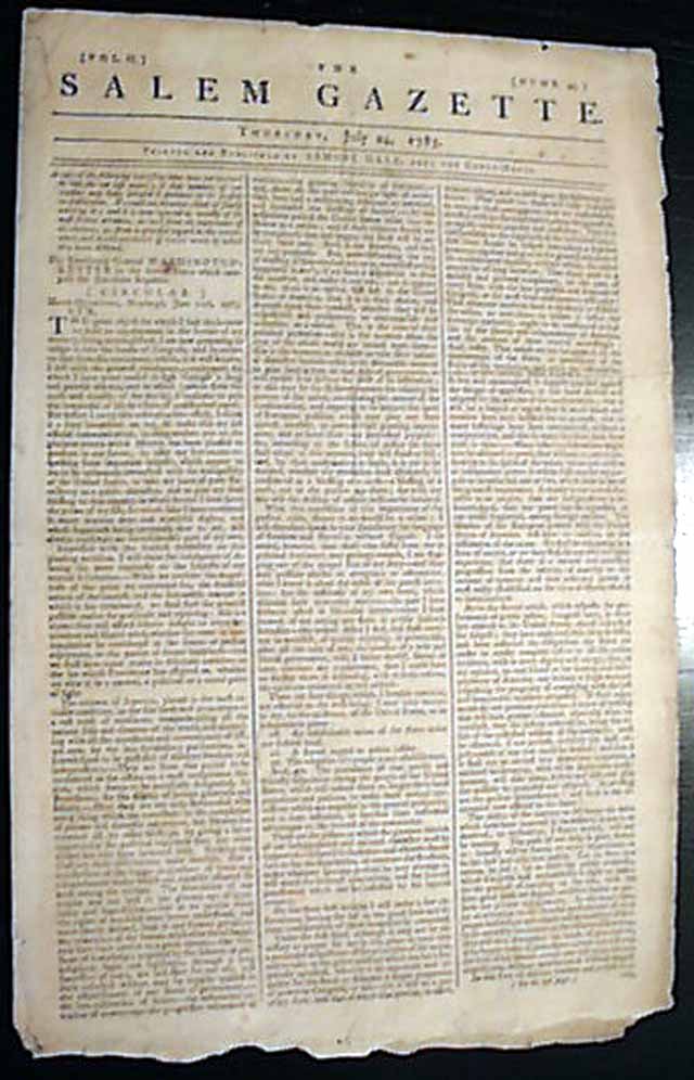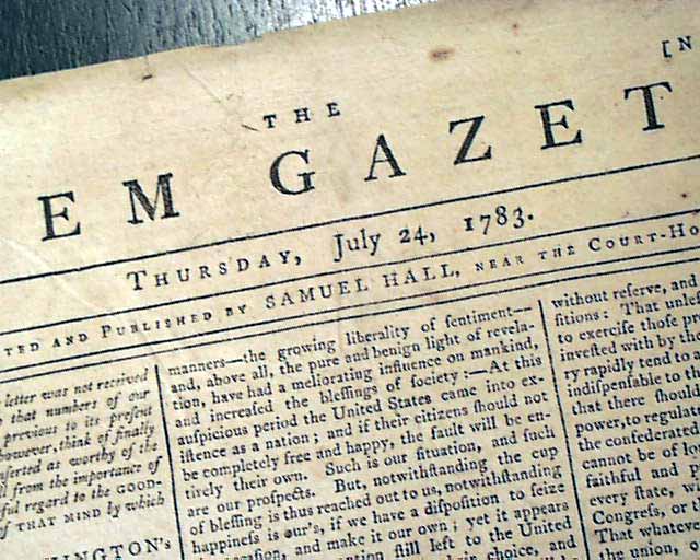 THE SALEM GAZETTE, Massachusetts, July 24, 1783 The entire front page and most of page 4 are taken up with one of the more noteworthy letters from General Washington during the war.