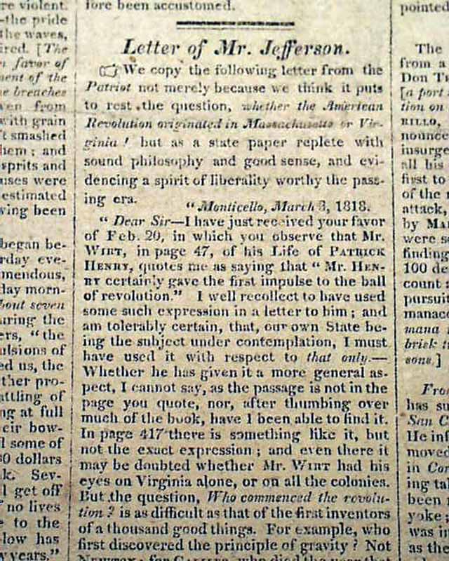 The front page also has a lengthy: "Letter of Mr. Jefferson" datelined from Monticello & signed in type: Th. Jefferson.