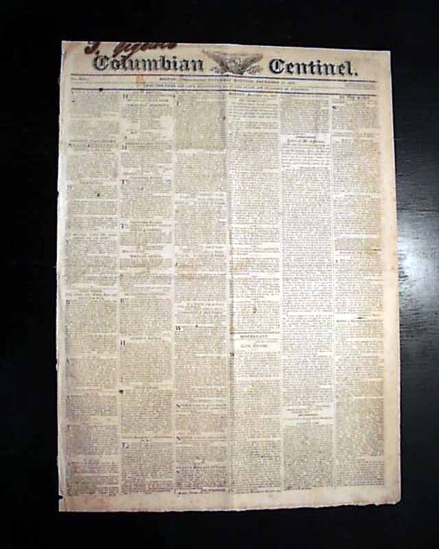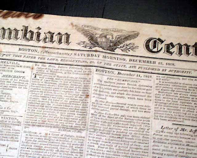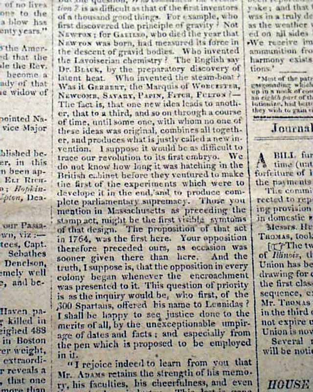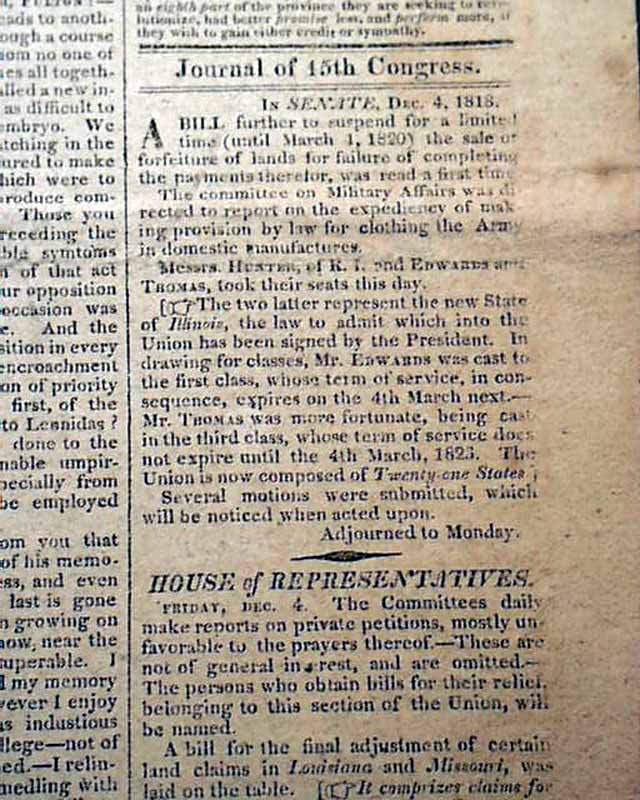 COLUMBIAN CENTINEL, Boston, Dec. 12, 1818 The front page has a rather inconspicuous report headed: Journal of 15th Congress" noting in part: "...Messrs. Hunter of R.I. and Edwards and Thomas took their seats this day. The two latter represent the new State of Illinois, the law to admit which into the Union has been signed by the President...The Union is now composed of Twenty-one States...".