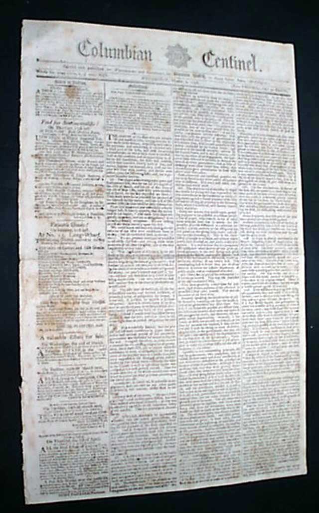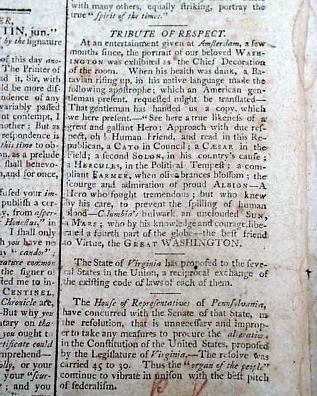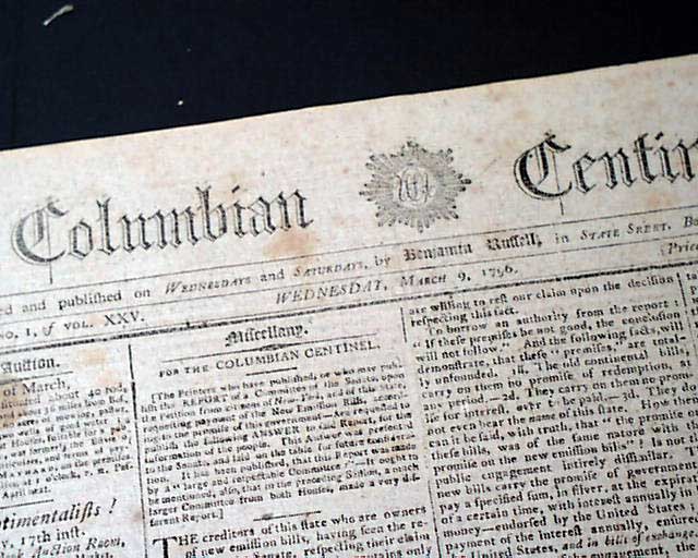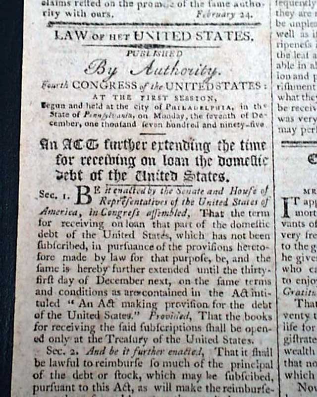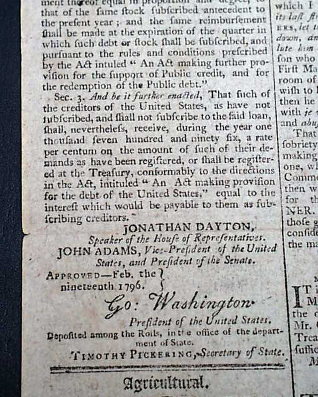 COLUMBIAN CENTINEL, Boston, March 9, 1796 Page 2 has an Act of Congress concerning a loan on the domestic debt which is signed in script type by the President: Go. Washington, and in block type by John Adams. Also on page 2 is a: "Tribute Of Respect" to: "...the Great WASHINGTON."