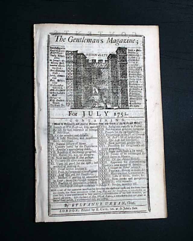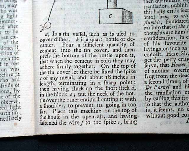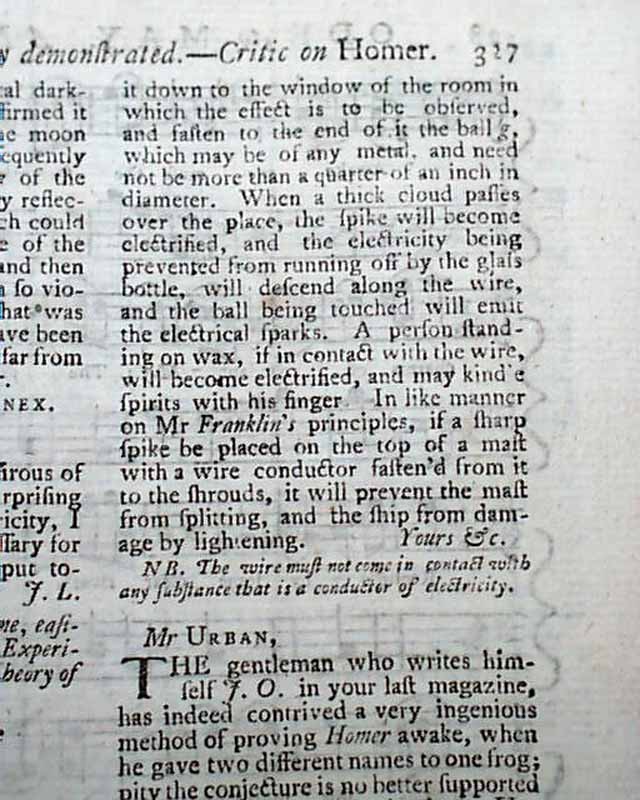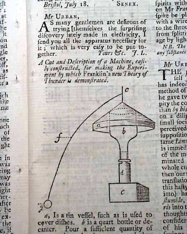 THE GENTLEMAN'S MAGAZINE, London, July, 1752 An inside page has an extremely significant article titled: "A Cut and Description of a Machine, easily Constructed, for Making the Experiment by which Franklin's new Theory of Thunder is demonstrated" with descriptive text showing how this experiment works. Each piece of the illustration is identified as well.