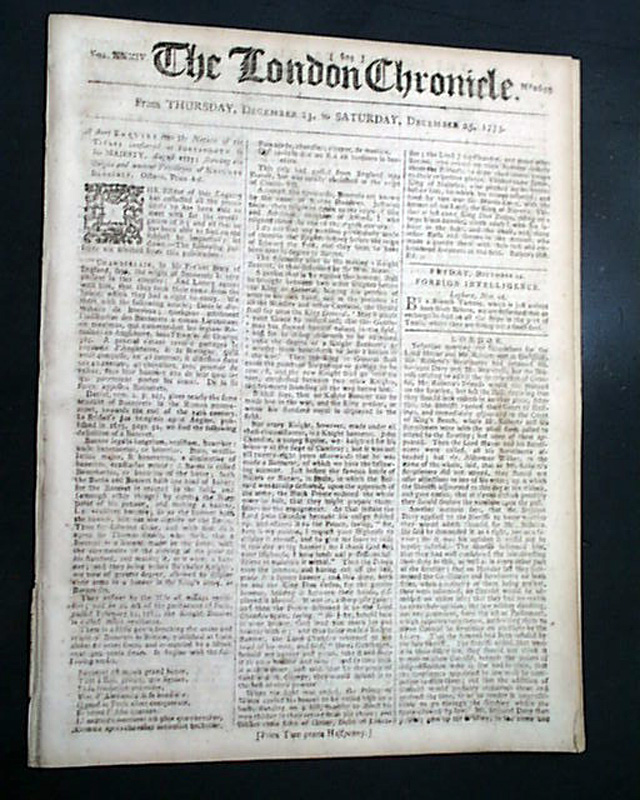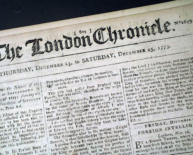 THE LONDON CHRONICLE, England, Dec. 25, 1773 The back page contains an extremely significant letter signed in type by B. Franklin, as the agent in London for the Mass. legislature.