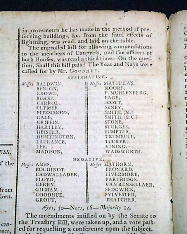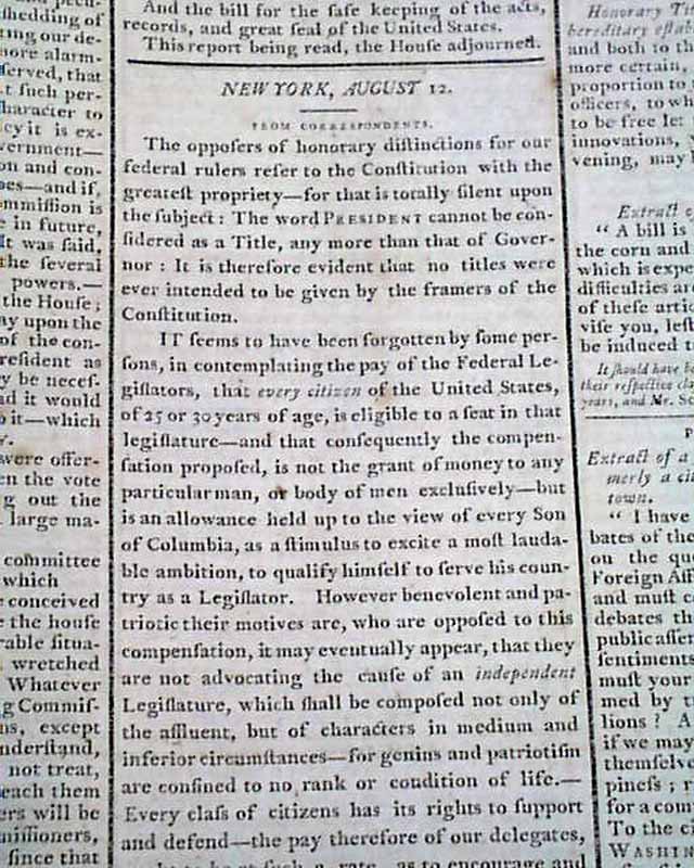 Various reports from Congress included a list of "The bills" being dealt with, including "For allowing compensations to the President and Vice President" & "And on the subject of Amendments" among others. Following this is an interesting letter on a title for the President, beginning: "The opposers of honorary distinctions for our federal rulers refer to the Constitution with the greatest propriety--for that is totally silent upon the subject: the world President cannot be considered as a title...evident that no titles were ever intended to be given by the framers of the Constitution..." and more.