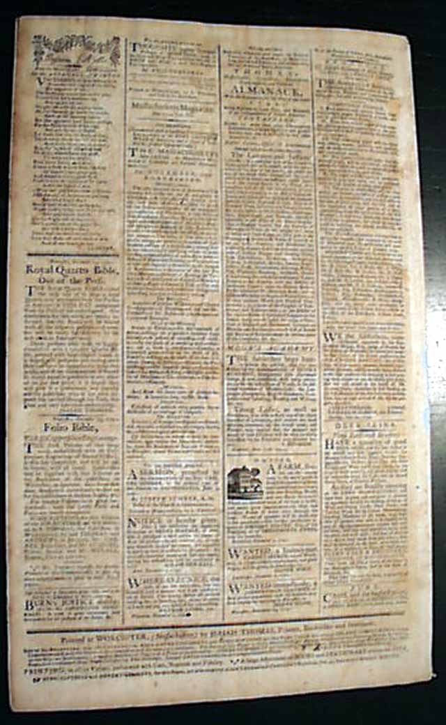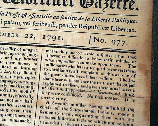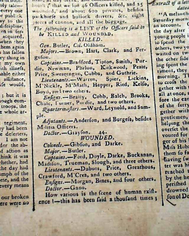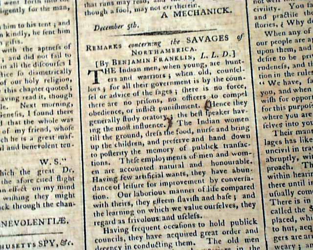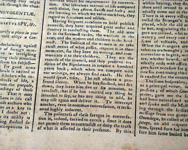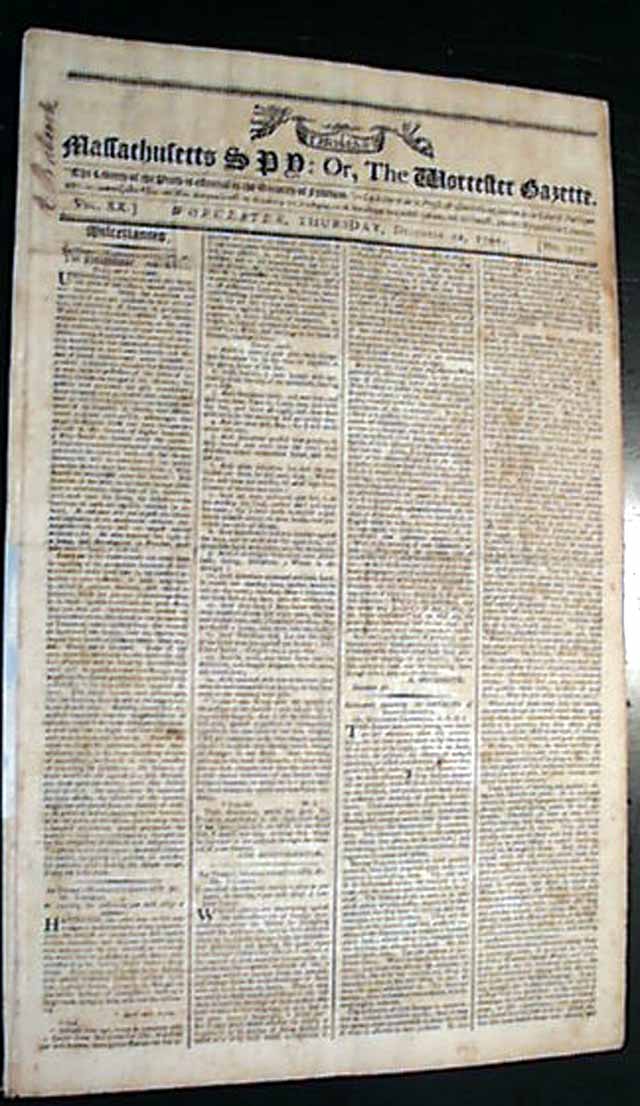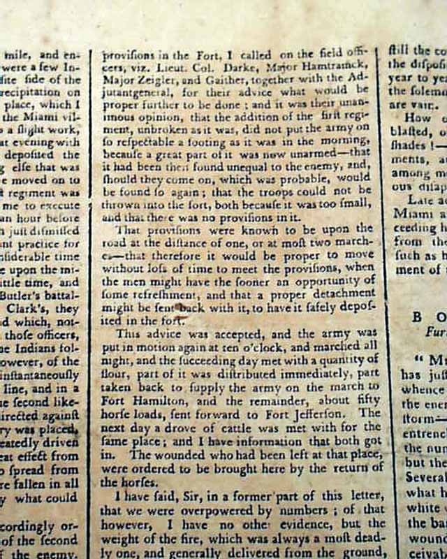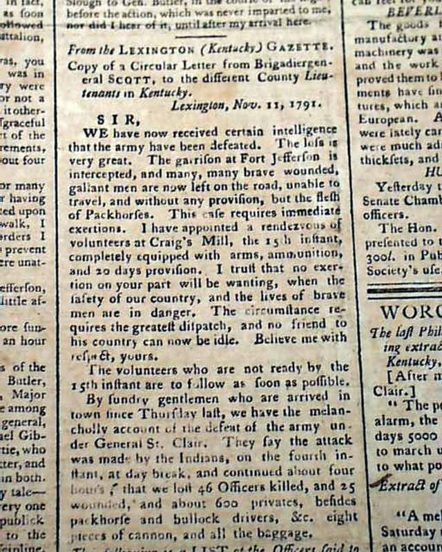 THOMAS'S MASSACHUSETTS SPY; OR THE WORCESTER GAZETTE, Boston, Dec. 22, 1791  This is one of the best issues we have seen on the historic Battle of the Wabash,  This was a tragic event in America's early military history, in which the American Army with 1,400 soldiers were swiftly devastated by an American Indian alliance of 1,500 warriors from nine different tribes.