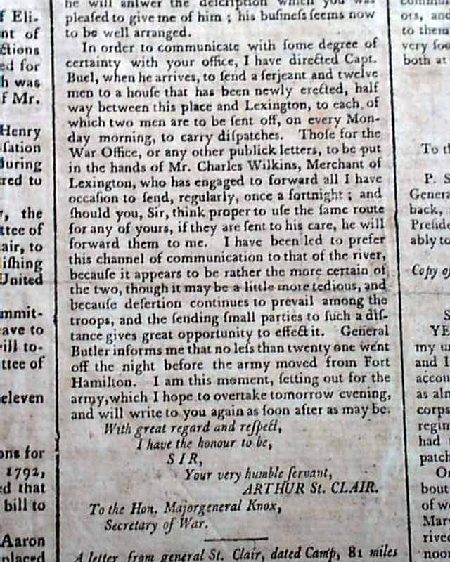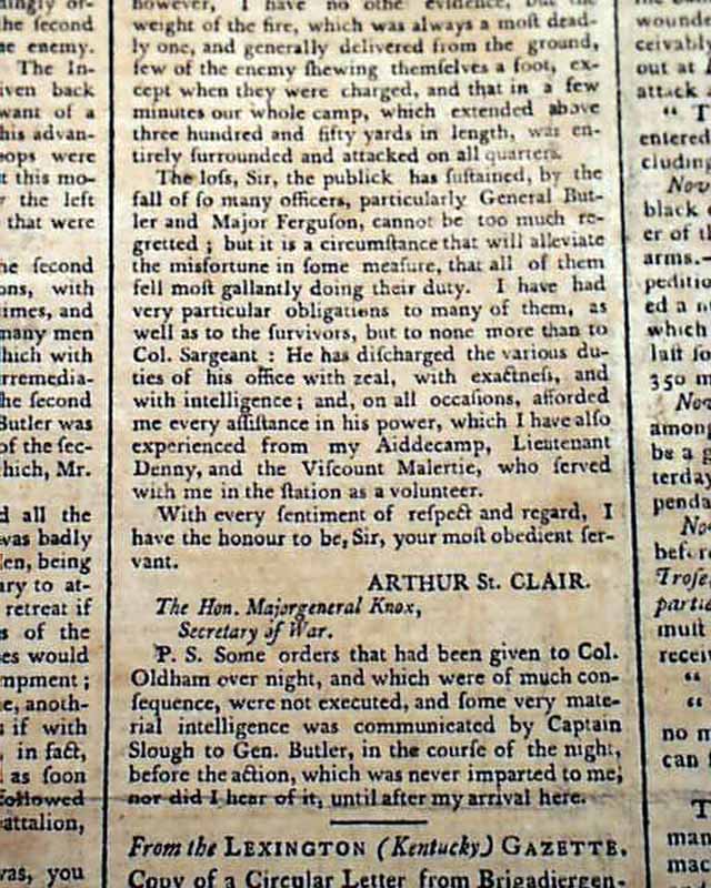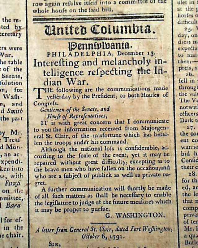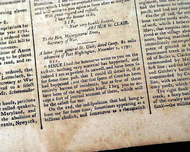 Pages 2 and 3 have a wealth of content on this battle, headed: "Interesting & Melancholy intelligence Respecting the Indian War" which begins with a letter to Congress signed by G. Washington in which he introduces a very lengthy letter from General Arthur St. Clair with much detail on the Battle of the Wabash.