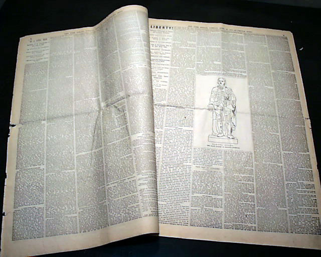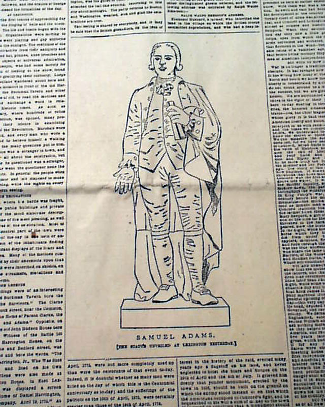 Acknowledging the 100th anniversary of the beginning of the Revolutionary War, with the Battle of Lexington & Concord, this newspaper includes on page 5 a print of the statue of "Samuel Adams" which was unveiled at Lexington.