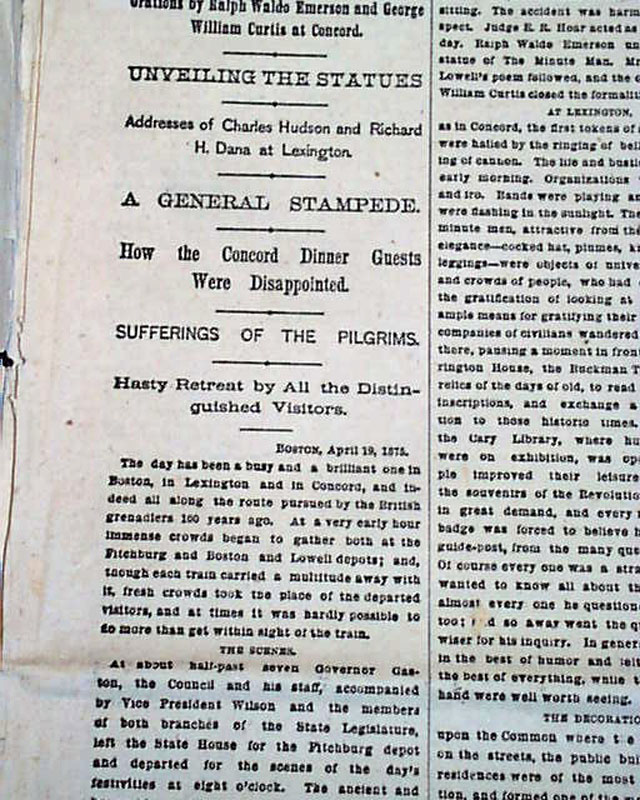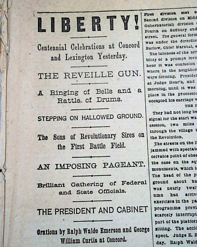 First column heads include: "LIBERTY!" "Centennial Celebrations at Concord and Lexington Yesterday" "A Ringing of Bells and a Rattle of Drums" "Stepping on Hallowed Ground" and more.