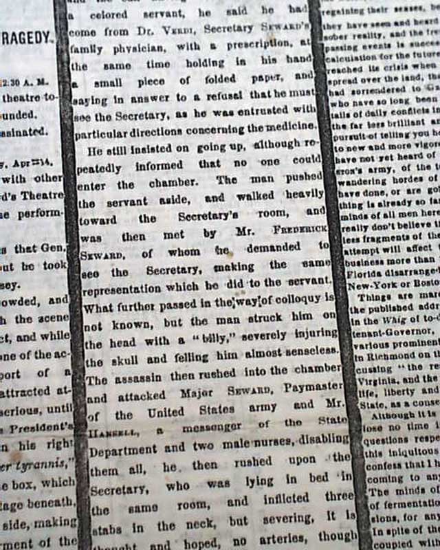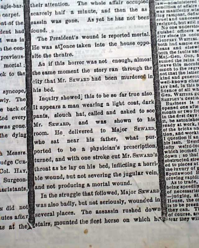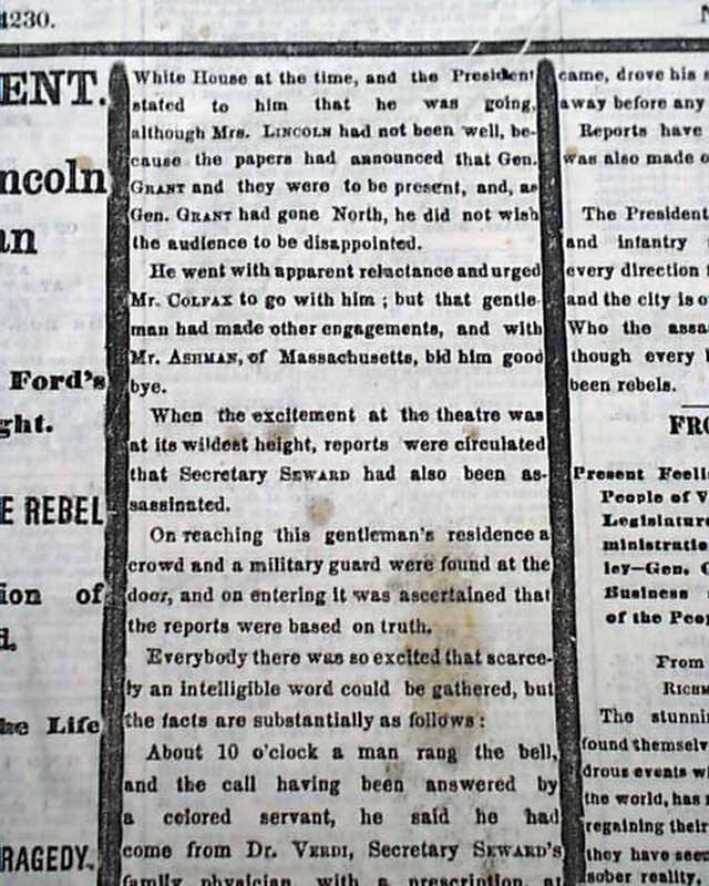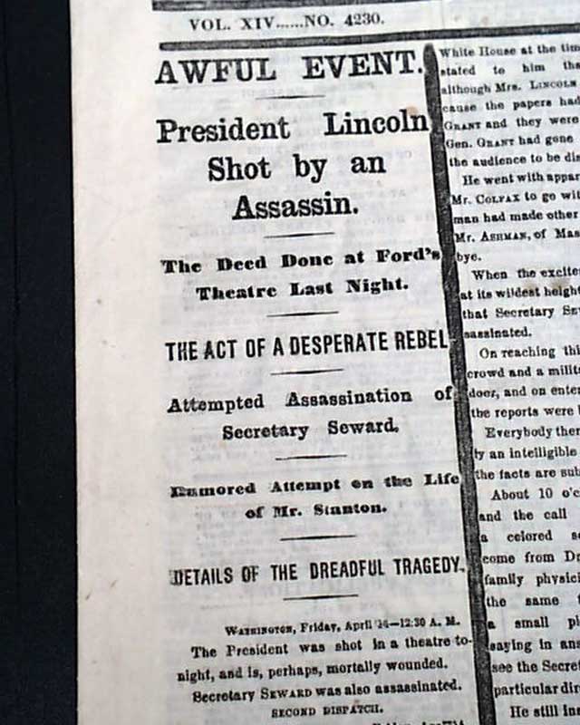 The first column heads tell it all: "AWFUL EVENT" "President Lincoln Shot by an Assassin" "The Deed Done at Ford's Theatre Last Night" "The Act Of A Desperate Rebel" "Attempted Assassination of Secretary Seward" "Rumored Attempt on the Life of Mr. Stanton" "Details of the Dreadful Tragedy". One can only imagine the horror of finding this report in the morning paper at a time when the nation should have been in celebration of the end of the Civil War.