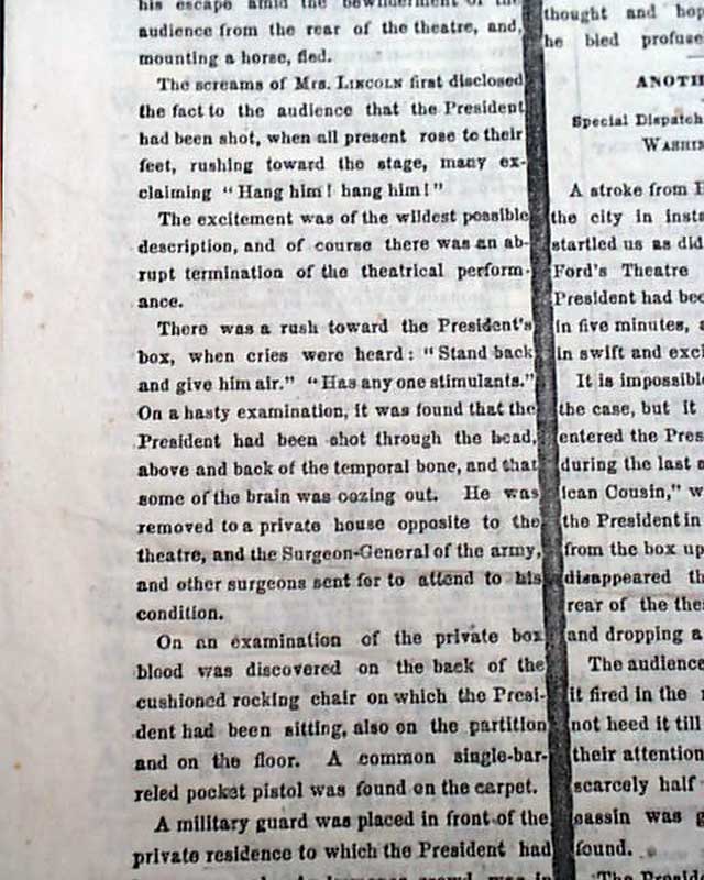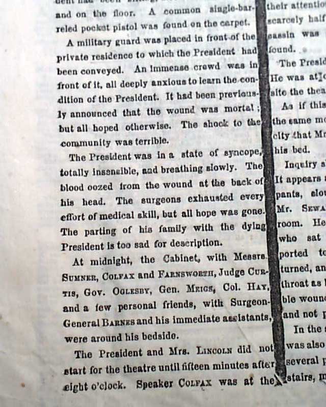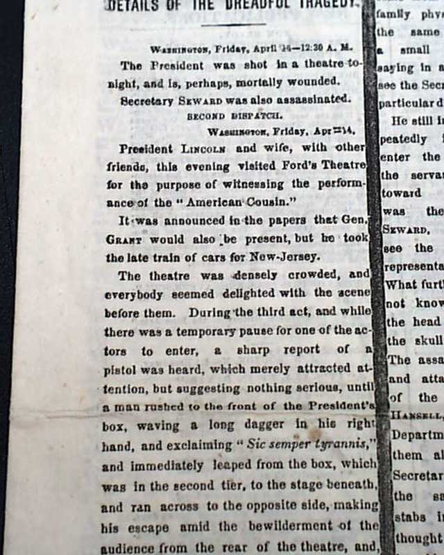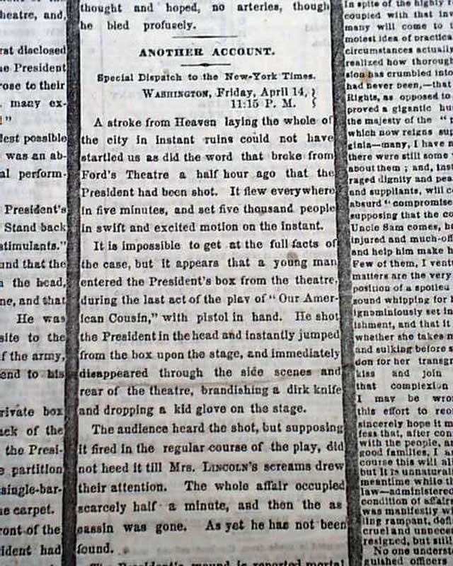 The report has much detail with various timed dispatches as the news arrived in the newsroom. The first dispatch has Lincoln as still being alive: "The President was shot in a theatre tonight, and is, perhaps, mortally wounded. Secretary Seward was also assassinated." The "second dispatch" goes on with some details: "...The theatre was densely crowded...During the third act & while there was a temporary pause for one of the actors to enter, a sharp report of a pistol was heard, which merely attracted attention but suggesting nothing serious until a man rushed to the front of the President's box, waving a long dagger in his right hand, and exclaiming 'Sic semper tyrannis" & immediately leaped from the box...to the stage beneath...The screams of Mrs. Lincoln first disclosed the fact to the audience that the President had been shot...all present rose to their feet...many exclaiming 'Hang him! hang him!...The President was in a state of syncope, totally insensible & breathing slowly. The blood oozed from the wound at the back of his head...all hope was gone. The parting of his family with the dying President is too sad for description..." with more. This is followed by: "Another Account" still with an April 14 dateline, which includes: "...The President's wound is reported mortal. He was at once taken into the house opposite the theatre." The report datelined: "Midnight" begins: "The President is reported dead. Cavalry and infantry are scouring the city in every direction for the murderous assassins...".