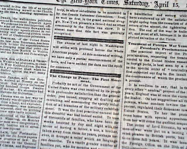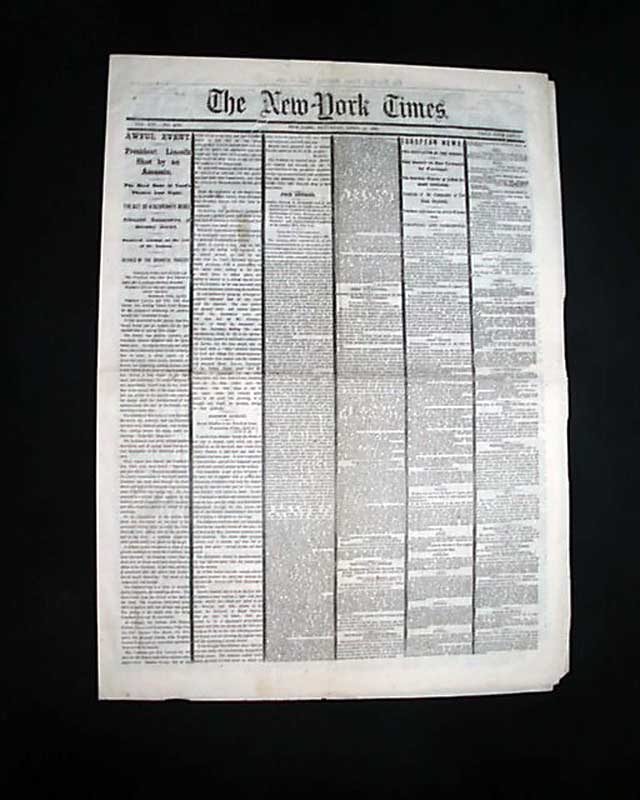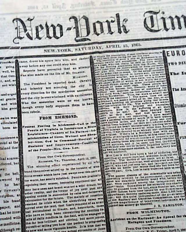 NEW YORK TIMES, April 15, 1865 Not only this event, but this title remains one of the most desired by collectors; a very significant event in American history reported by one of the most respected newspapers in the country.