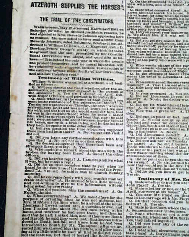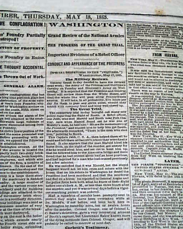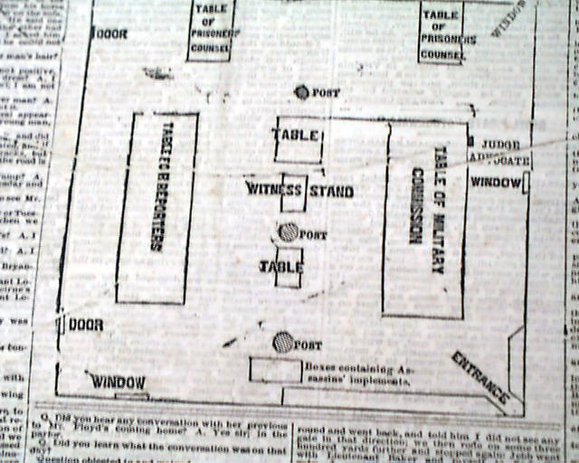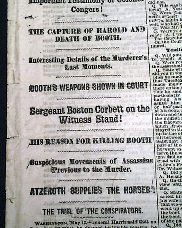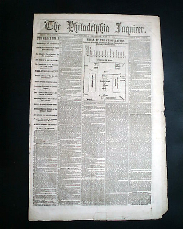 THE PHILADELPHIA INQUIRER, May 18, 1865 A displayable issue as the front page features a quite unusual illustration headed: "TRIAL OF THE CONSPIRATORS. Interior View of the Court Room Occupied by the Military Commission."