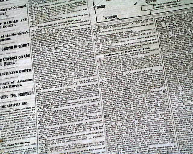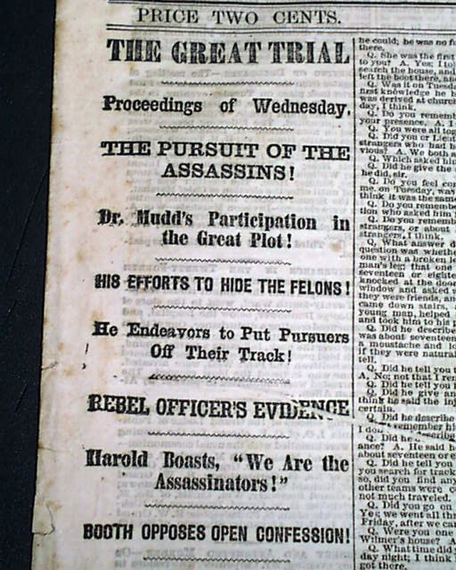 There are nice first column heads including: "THE GREAT TRIAL" "The Pursuit Of The Assassins!" "Dr. Mudd's Participation in the Great Plot!" "His Efforts Top Hide The Felons!" "He Endeavors to Put Pursuers Off Their Track!" "Harold Boasts, 'We Are the Assassinators!" "Booth Opposes Open Confession!" "The Capture of Harold and Death of Booth" and much more.