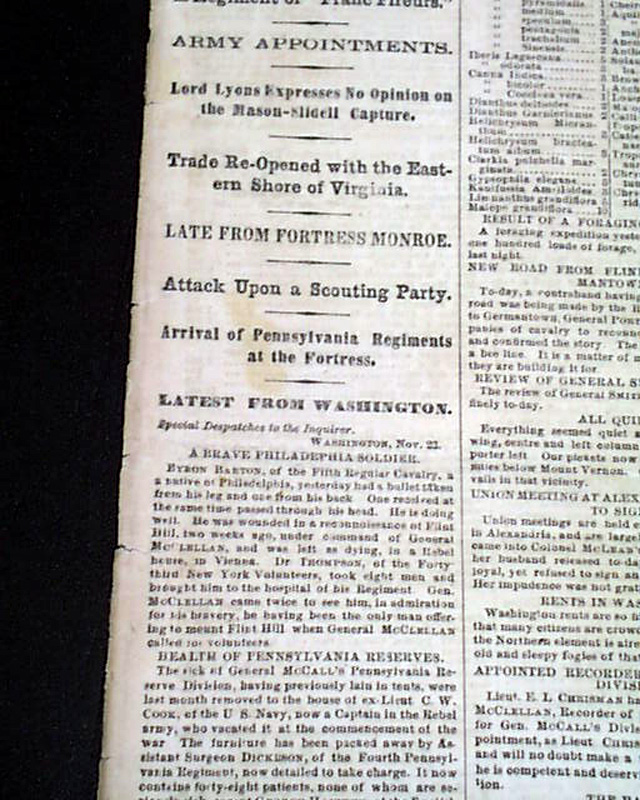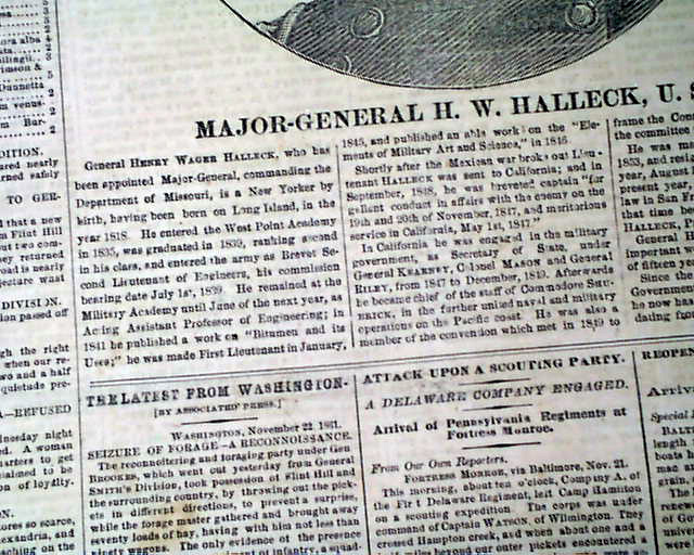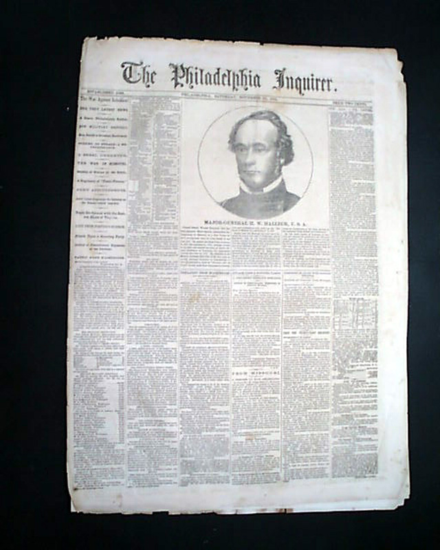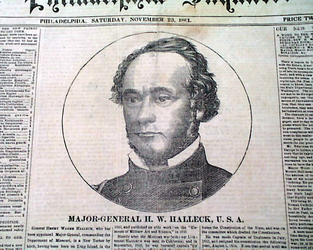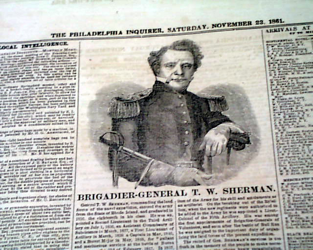 THE PHILADELPHIA INQUIRER, Nov. 23, 1861 The front page features a nice print of: "Major-General H. W. Halleck, U.S.A." with some biographical information as well. The back page features a print of: "Brigadier-General T. W. Sherman" with information on him as well.