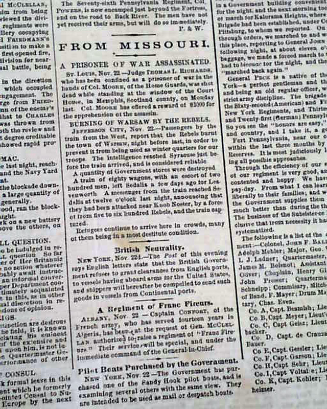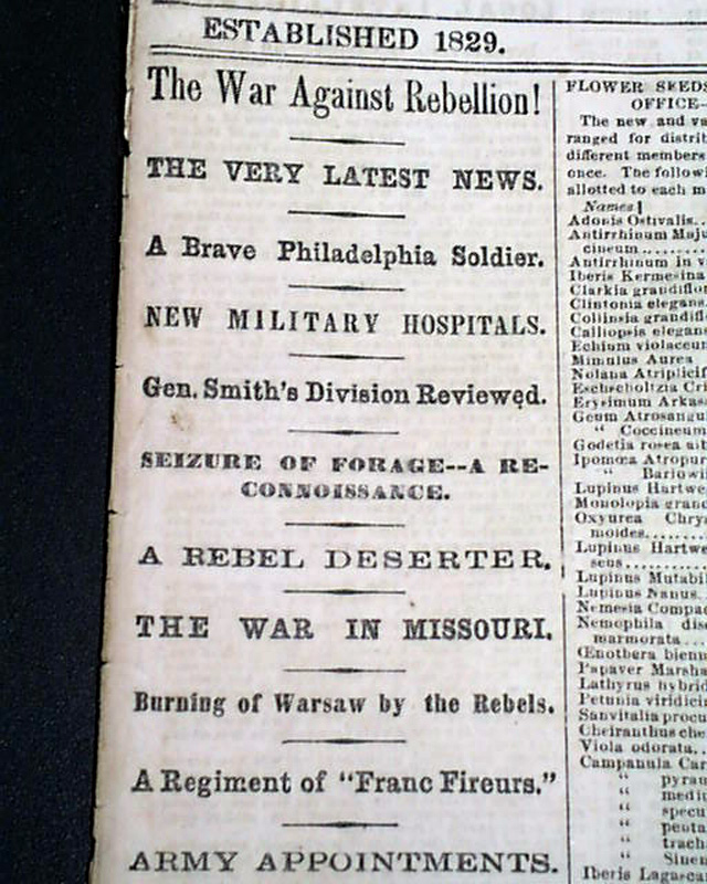 Front page first column heads on the Civil War include: "The War Against Rebellion!" "A Rebel Deserter" "The War In Missouri" "Army Appointments" and more.