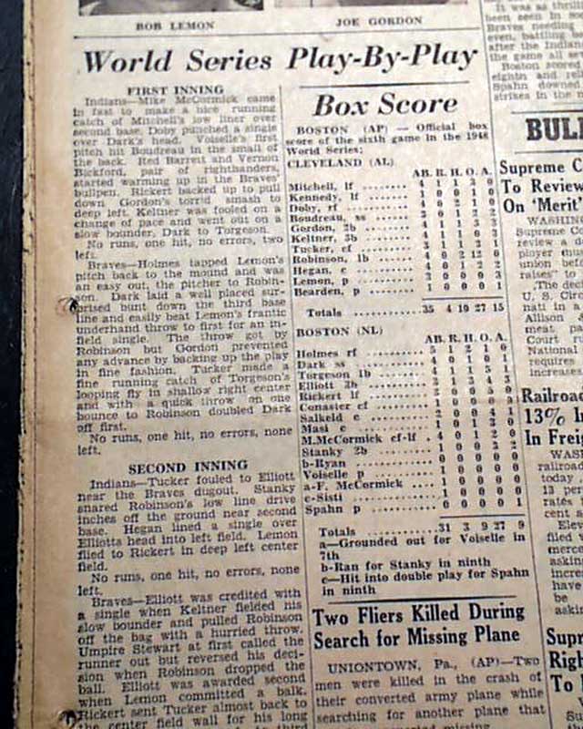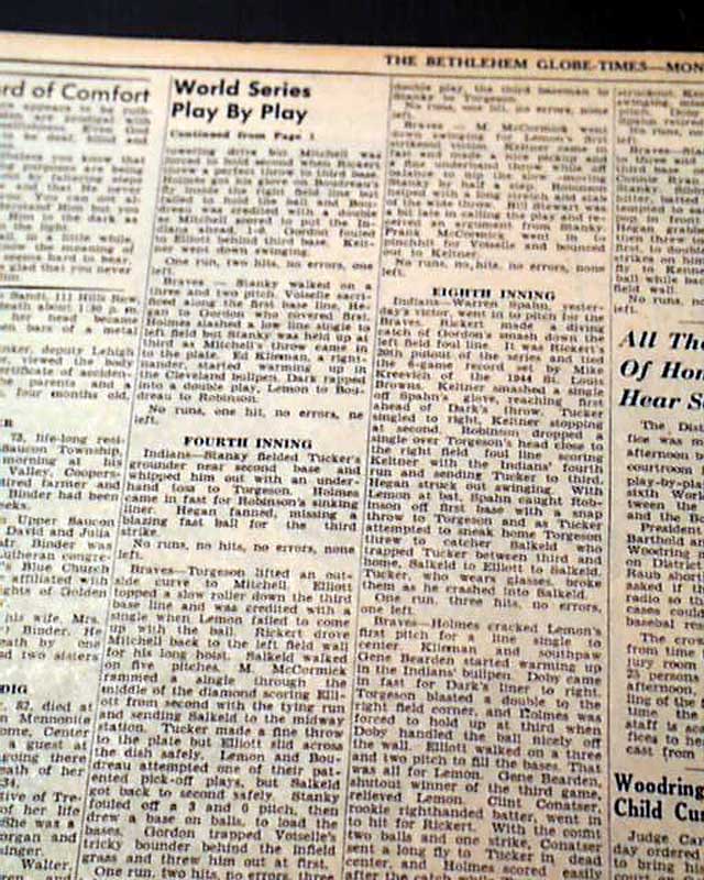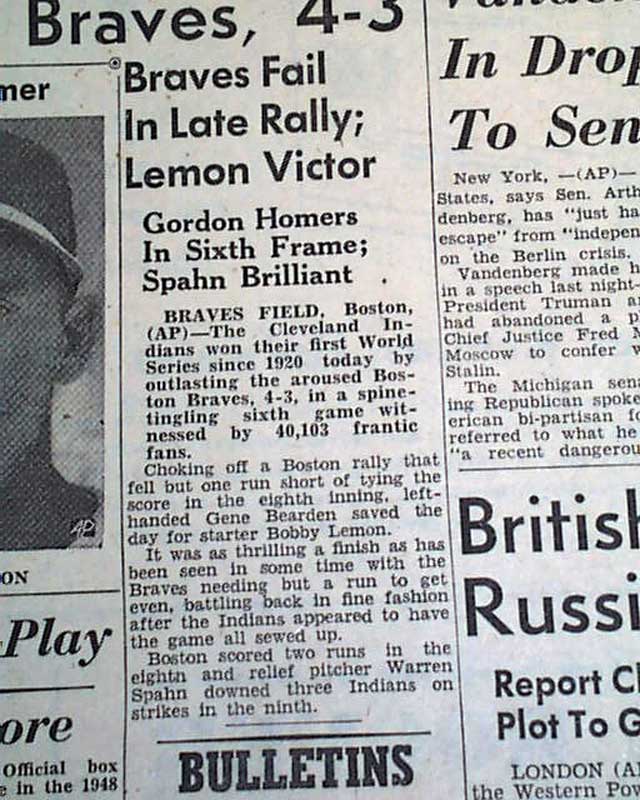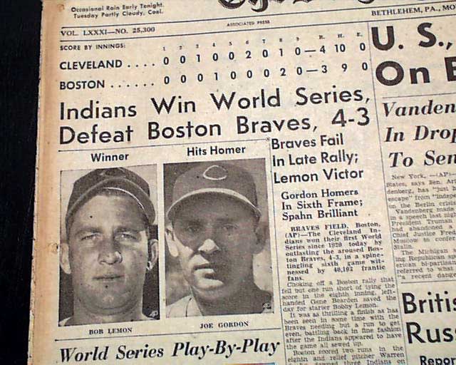 The top of the front page has a three column heading underneath the final scoreboard announcing the Major League Baseball world champions of 1948: "Indians Win World Series, Defeat Boston Braves, 4-3" with subheads, two player photos and inning by inning description which continues inside.