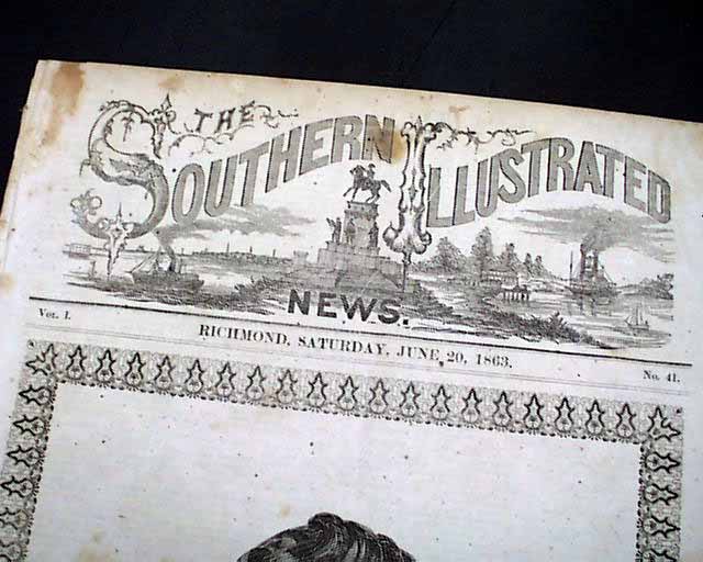 SOUTHERN ILLUSTRATED NEWS, Richmond, June 20, 1863 A very rare publication from the Confederacy which seldom comes to the collector market. Although much of the content was literary in nature, there are news reports and a few illustrations.