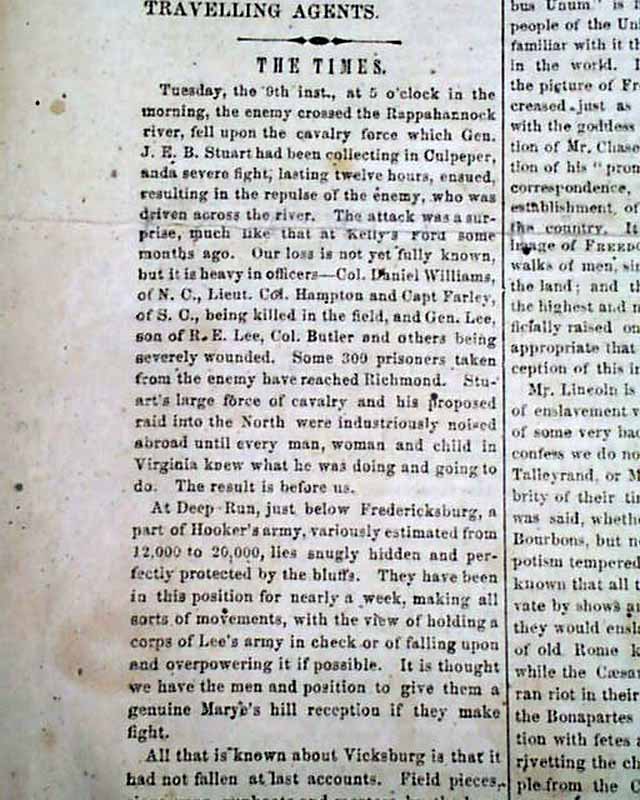 Also on page 4 is a report headed "The Times" which contains various war-related reports including: "...the enemy crossed the Rappahannock river, fell upon the cavalry force which Gen. J.E.B. Stuart had been collecting in Culpeper, and a severe fight, lasting 12 hours, ensued resulting in the repulse of the enemy...All that is known about Vicksburg is that it had not fallen at last accounts...Gen. Bragg is said to be in motion..." and more. Also an article headed: "Freedom and the Fourth of July".