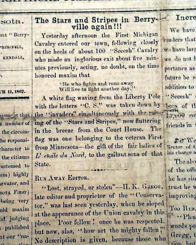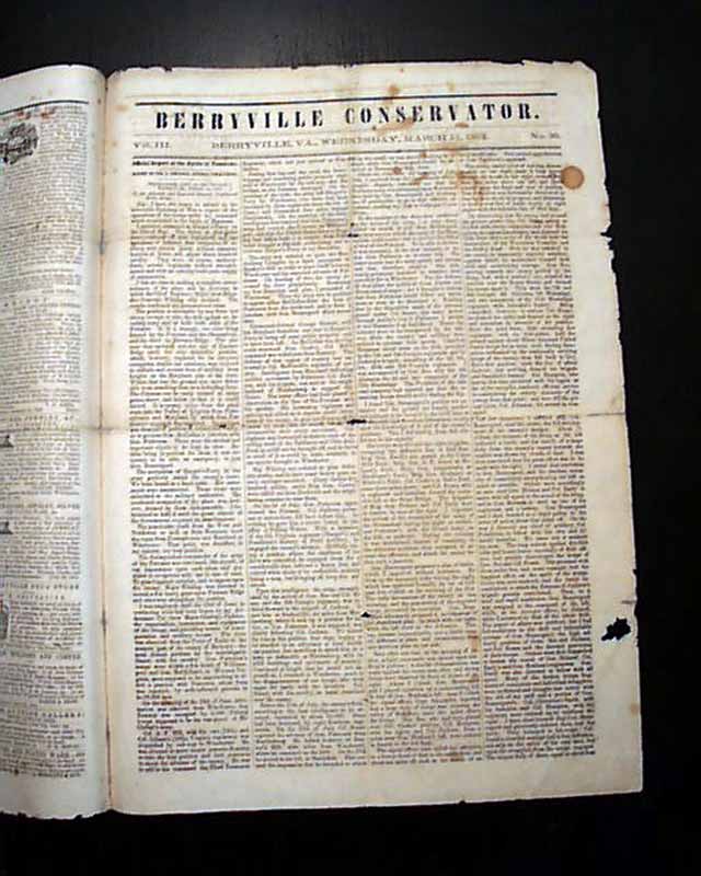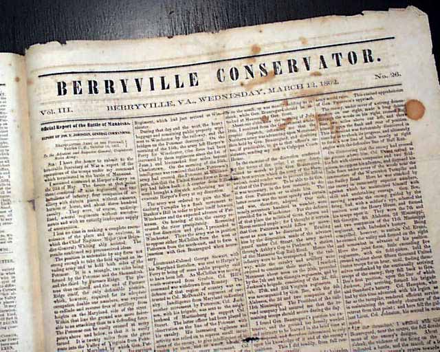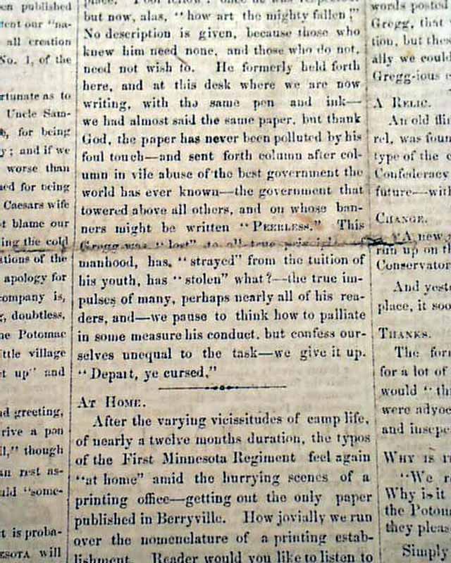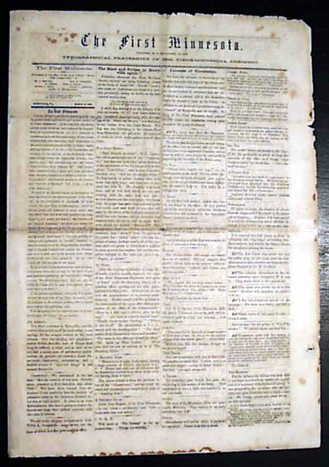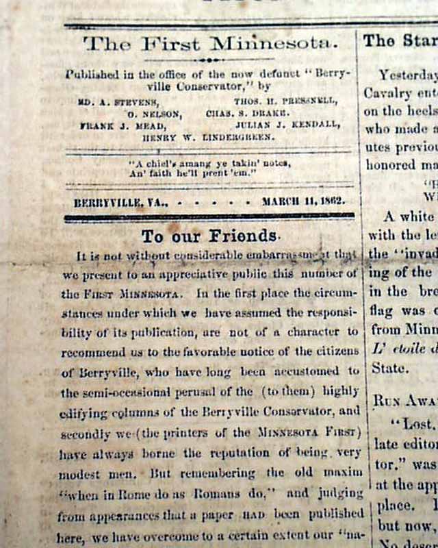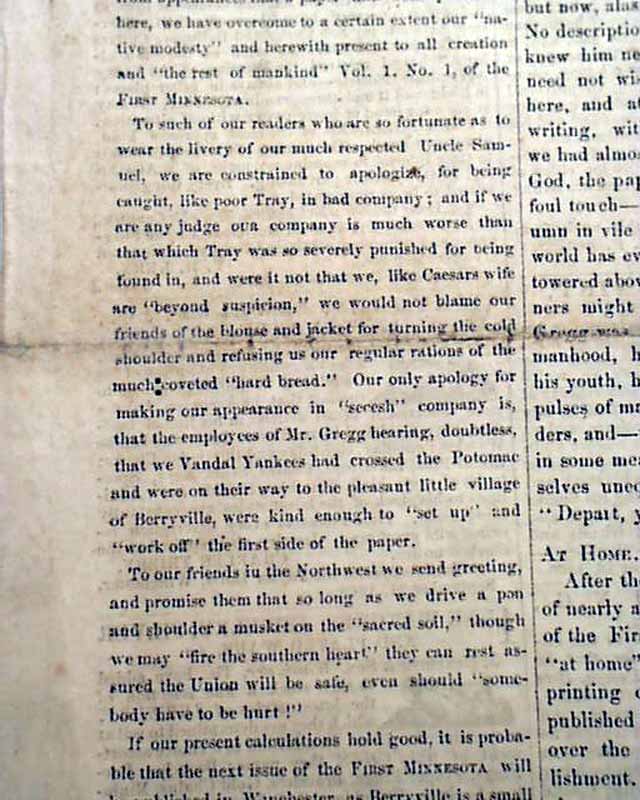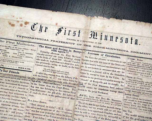 THE FIRST MINNESOTA, Berryville, Virginia, March 11, 1862  A fascinating & very rare newspaper published under circumstances very similar to what would happen with the Daily Citizen of Vicksburg in early July, 1863.