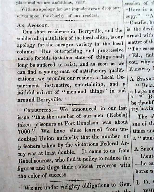 As is explained on the front page, "...Our only apology for making our appearance in 'secesh' copy is, that the employees of Mr. Gregg [publisher of the Berryville Conservator] hearing, doubtless, that we Vandal Yankees had crossed the Potomac and were on their way to the pleasant little village of Berryville, were kind enough to 'set up' and 'work off' the first side of the paper...".