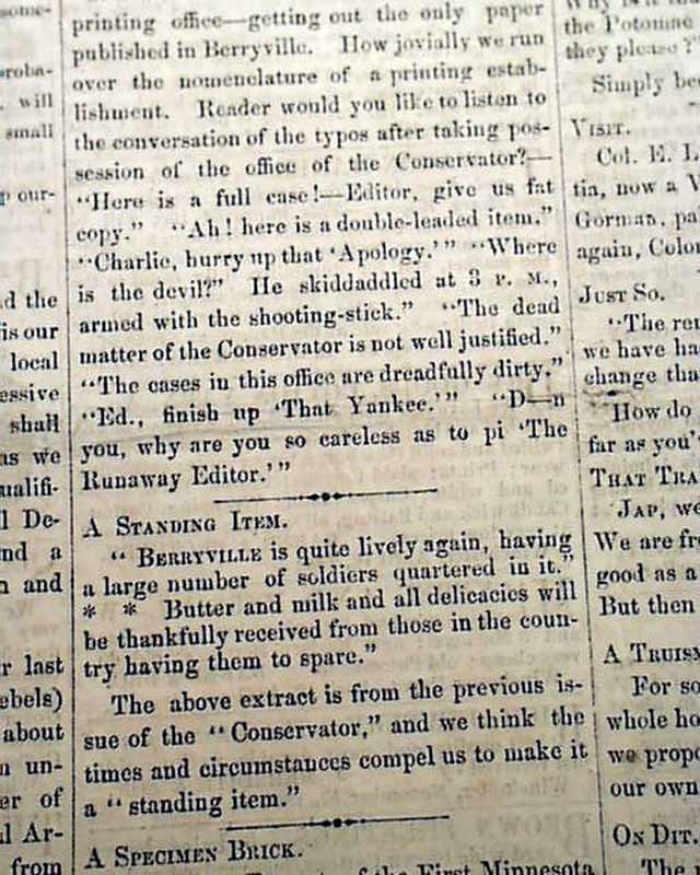The First Minnesota was sent along with an entire brigade to Berryville, Virgina in March 10, 1862, to re-open the Baltimore and Ohio railroad to Harper’s Ferry. Upon the brigade’s arrival, the Confederate forces left town, fleeing with them the owner of the Berryville Conservator, the town’s secessionist newspaper. Filled with writers, editors, and assorted other newspapermen, the First Minnesota’s “Typographical Fraternity” couldn’t resist, issuing the first edition on March 11, 1862.