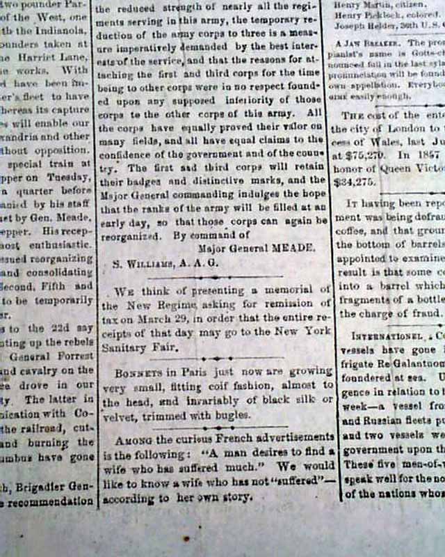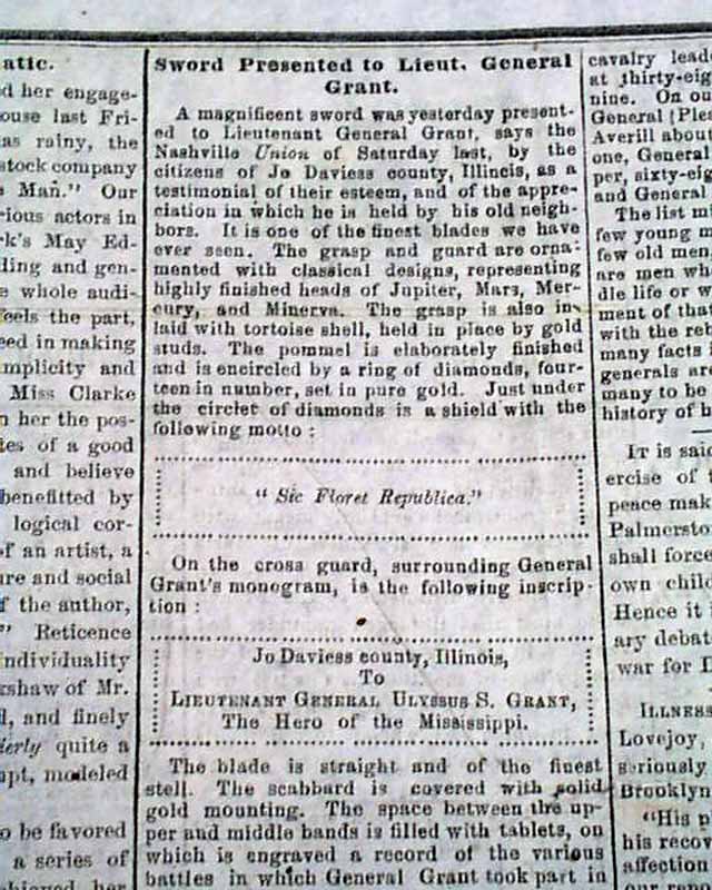 This is the volume 1, number 28 issue. Page 2 includes: "War Intelligence" "Reorganization of the Army of the Potomac" which includes a lengthy document signed in type by Major General Meade. Also: "Sword Presented to Lieut. General Grant which includes a letter signed U.S. Grant