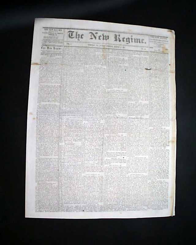 background: This rare March 27, 1864, issue of The New Regime serves as a primary source for the administrative and symbolic transitions occurring within the Union high command just weeks before the brutal Overland Campaign. Published in occupied Norfolk under martial law, the paper captures a critical moment of consolidation, most notably through the lengthy document by Major General George Meade outlining the reorganization of the Army of the Potomac—a move that streamlined five corps into three to prepare for the final push against Lee. The inclusion of the sword presentation to Lieutenant General Ulysses S. Grant, complete with his typed response, underscores his rapid ascent to General-in-Chief and his relocation to the Virginia theater, providing a stark contrast to the escapist "Crown Matrimonial" literary features on the outer pages. As a fragile, four-page artifact of "soldier journalism," this specimen is a significant rarity, representing the Union's effort to maintain both military order and ideological control in one of the South's most vital liberated seaports.