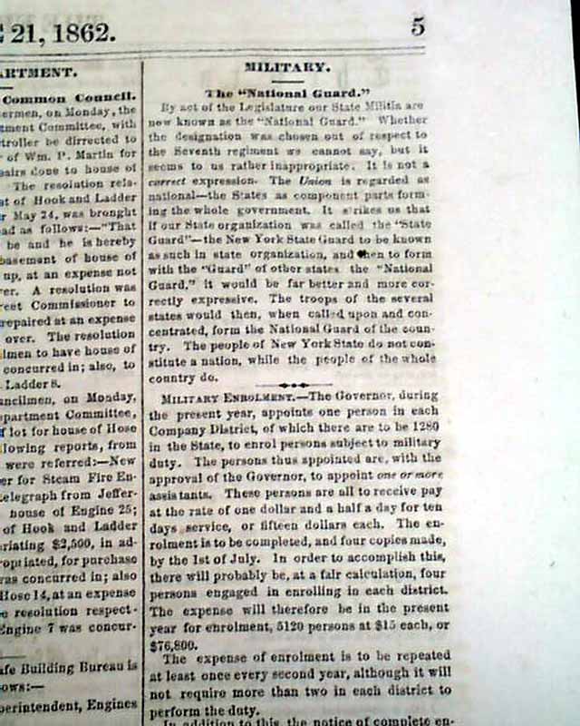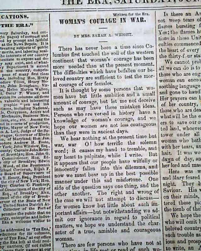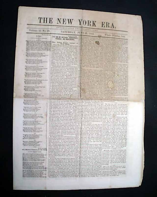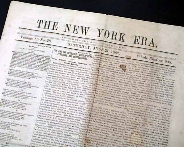 THE NEW YORK ERA, June 21, 1862 Despite from during the Civil War & published in New York City, this is a very scarce title, this being the first & only issue we've discovered in our 50+ years. Plus the American Antiquarian Society has just one issue. It began publication in 1860. It's motto as noted in the mothered: is "Indomitable and Independent".