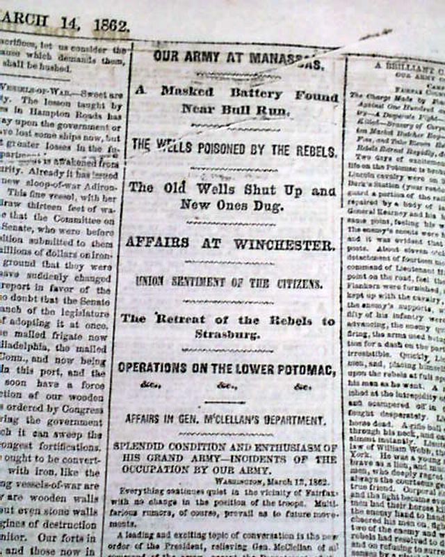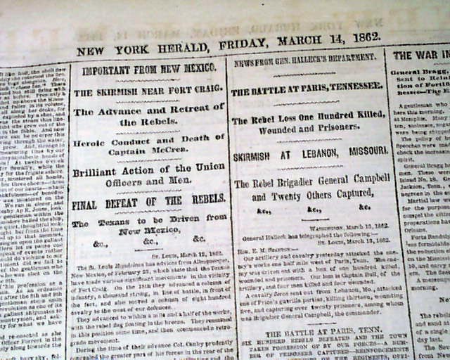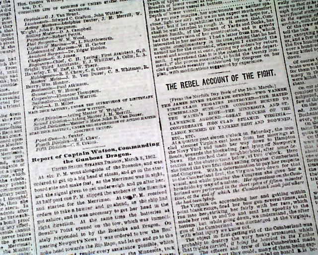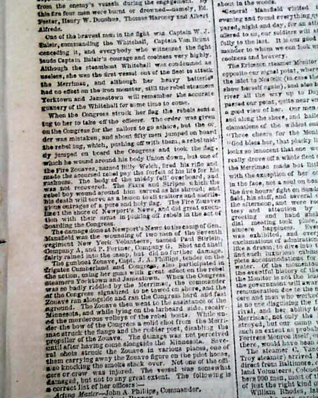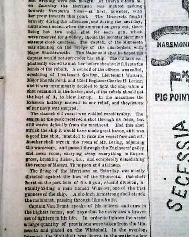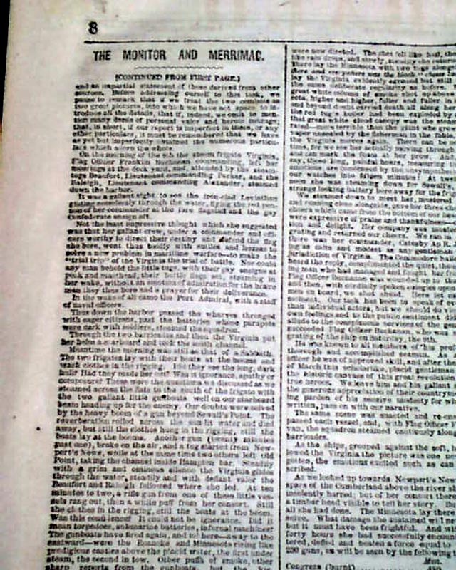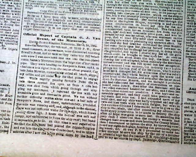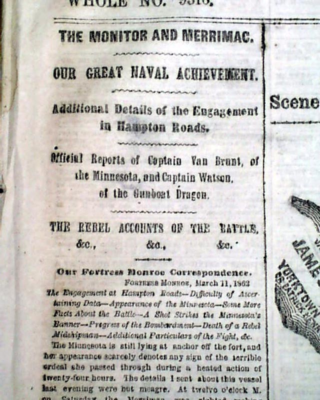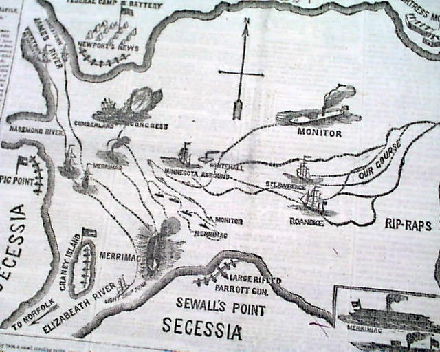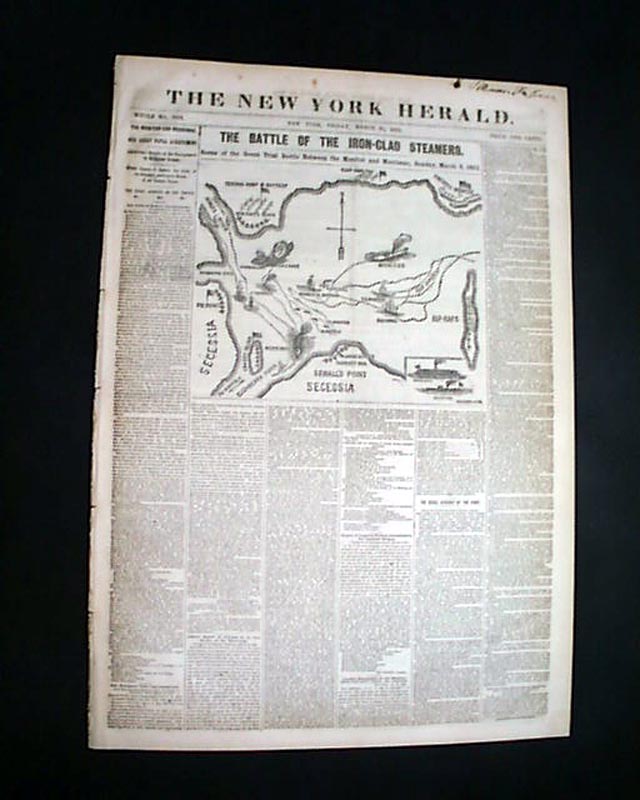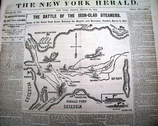 NEW YORK HERALD, March 14, 1862  This is arguably the best newspaper to have on the famous naval battle between the Monitor and the Merrimac, with the front page dominated by a large and detailed map headed: "THE BATTLE OF THE IRON-CLAD STEAMERS. Scene of the Great Trial Battle Between the Monitor and Merrimac, Sunday, March 9, 1862."