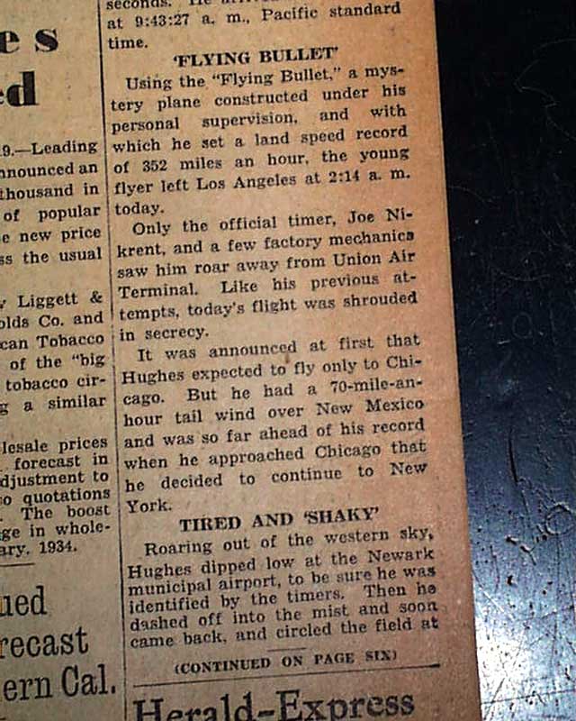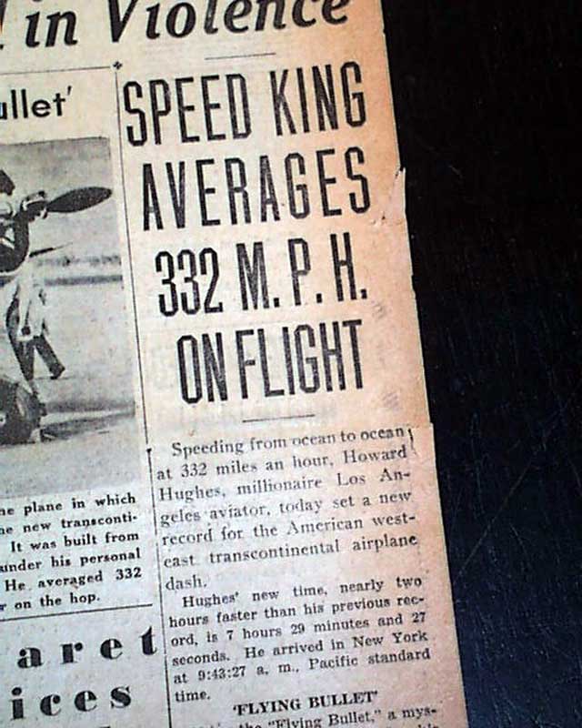 The front page has a great banner headline: "HUGHES SETS L.A.-N.Y. AIR RECORD; FLIES ACROSS U.S. IN 7 HRS., 29 MIN." with subhead and two related photos.