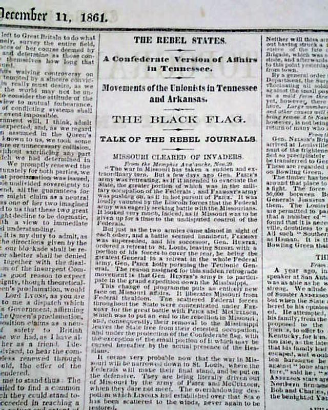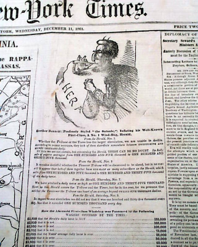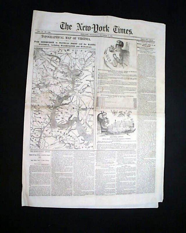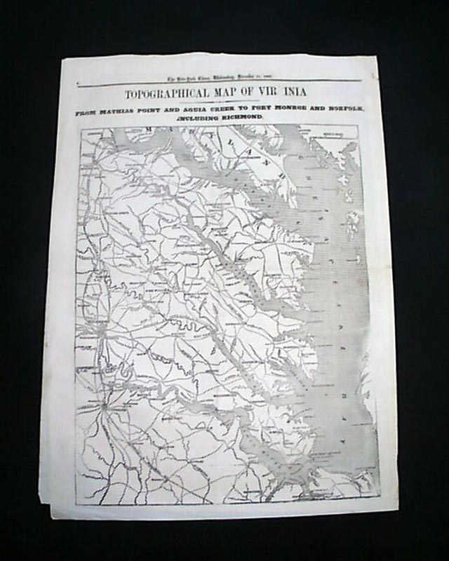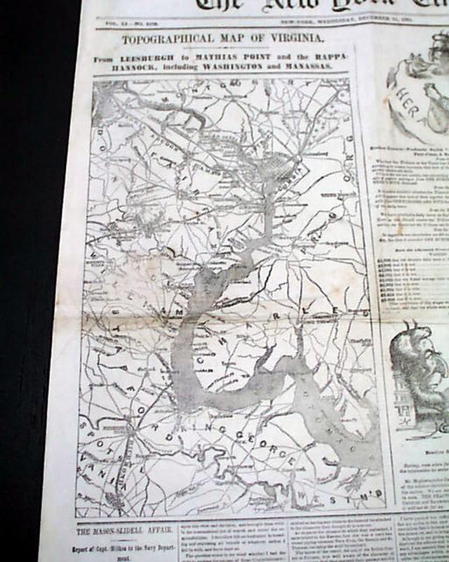 NEW YORK TIMES, Dec. 11, 1861 The front page has two interesting features: first, a nice Civil War map headed: "Topographical Map Of Virginia. From Leesburgh to Mathias Point and the Rappahannock, including Washington & Manassas." showing much detail.